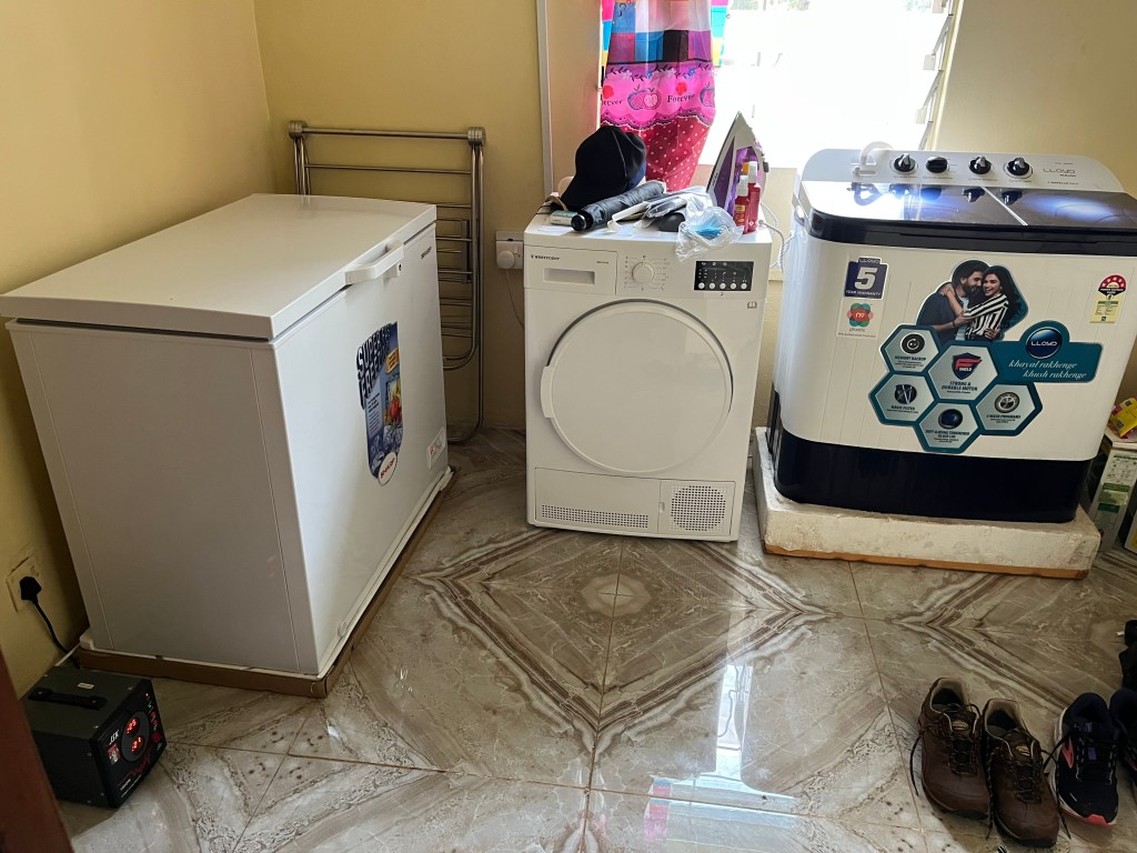 Sie zeigten uns zwei Klimaanlagen für die beiden Schlafräume; den Kühlschrank; einen Gasherd mit elektronischen Zünder; eine Gefriertruhe (hatten wir noch nie); einen Warmwasserboiler im Bad; eine Waschmaschine und einen Trockner. Außerdem zwei Ventilatoren, Steckdosen zum Laden von Handy – Computer etc. und natürlich Licht.