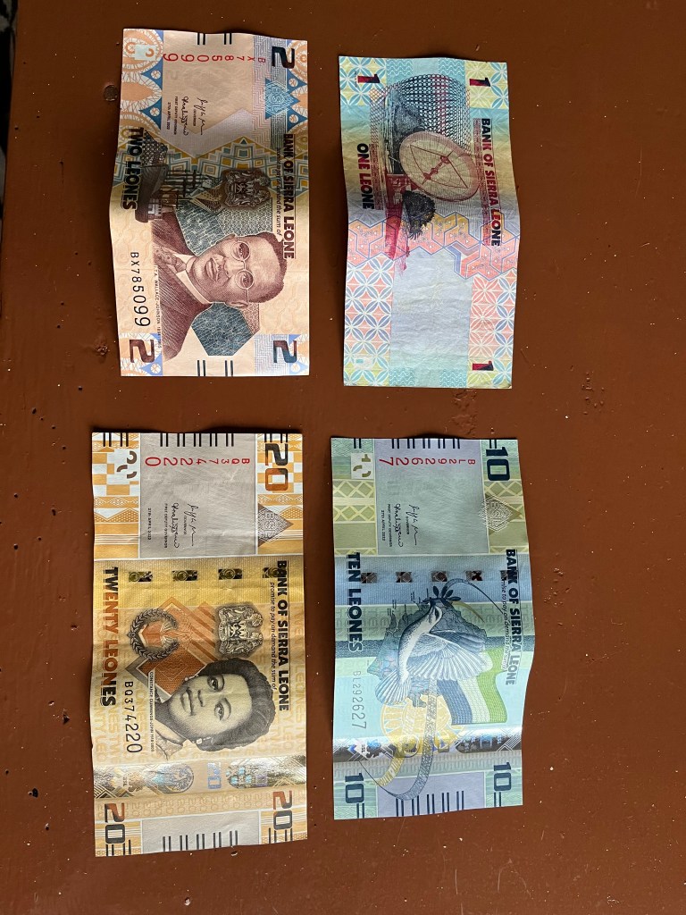 Als wir dann beim Filialleiter Egbert sitzen, unser Anliegen vortragen, Dokumente vorzeigen und ausfüllen, dauert es einen Augenblick und dann erhalten wir unser Geld. Wir heben einen größeren Betrag ab und erhalten sie mit den größten Scheinen, die es hier gibt: 20 Leones (umgerechnet 1,40 Euro). Es ist also ein ziemliches Bündel Geld, was da vor uns liegt. Nun gehts ans Zählen. Das sollte man wirklich machen und ist überhaupt nicht peinlich. Denn es kommt immer wieder vor, dass sich in den Hinterzimmern verzählt wird. Bei unserer Abhebung im Chefzimmer stimmte alles und wir hatten nun nach drei Wochen endlich eigenes Geld in der Hand. Jetzt konnten wir unsere Schulden zurückzahlen. Außerdem sind wir am nächsten Tag todesmutig selbst zum Einkaufen gefahren – aber das ist eine andere Geschichte.