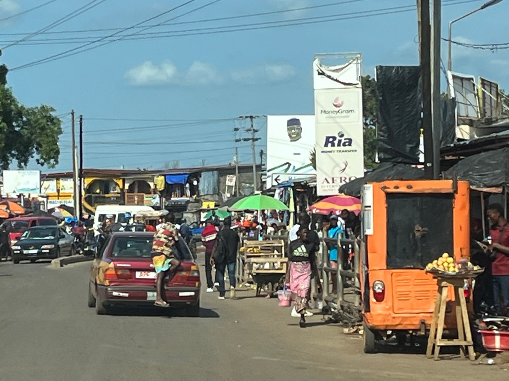 Nun liefen Amadu und Ralf den ganzen Weg durch dieses „Dorf“ zur Hauptstraße, um gen Heimat nach Jui Junction (Kreuzung) zu kommen – wo wir dann die Straße zum TECT nehmen. Aber wie? Klar mit Taxi – aber was für einem?