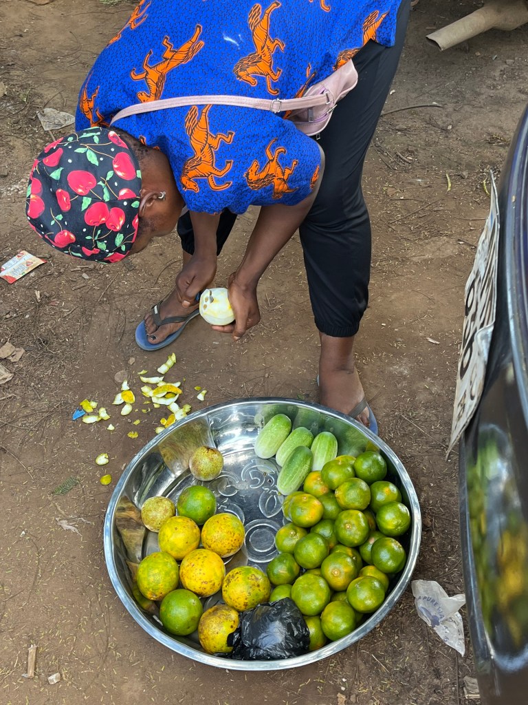 Amadu meinte, ich solle davon nehmen – Orangen – die seien gut für den Energiehaushalt. So nahm dann auch Ralf zwei von den gelbgrünen braungesprenkelten Orangen. Sie wurden von der Dame vorbereitet, indem sie die äußere harte Schale mit dem Messer entfernte, dann einen Deckel oben abschnitt und dann konnte man selber hinein beißen und essen wie und was man davon wollte. Die innere Haut – Kerne etc. dann einfach in die Gegend spucken. Das war sehr lecker und erfrischend.