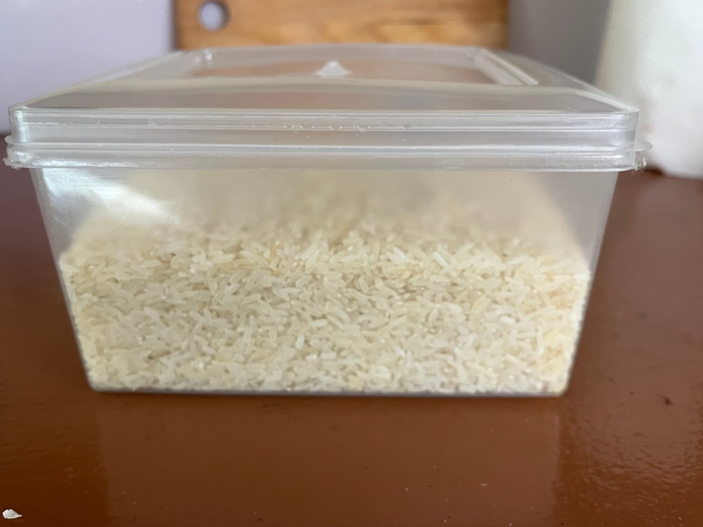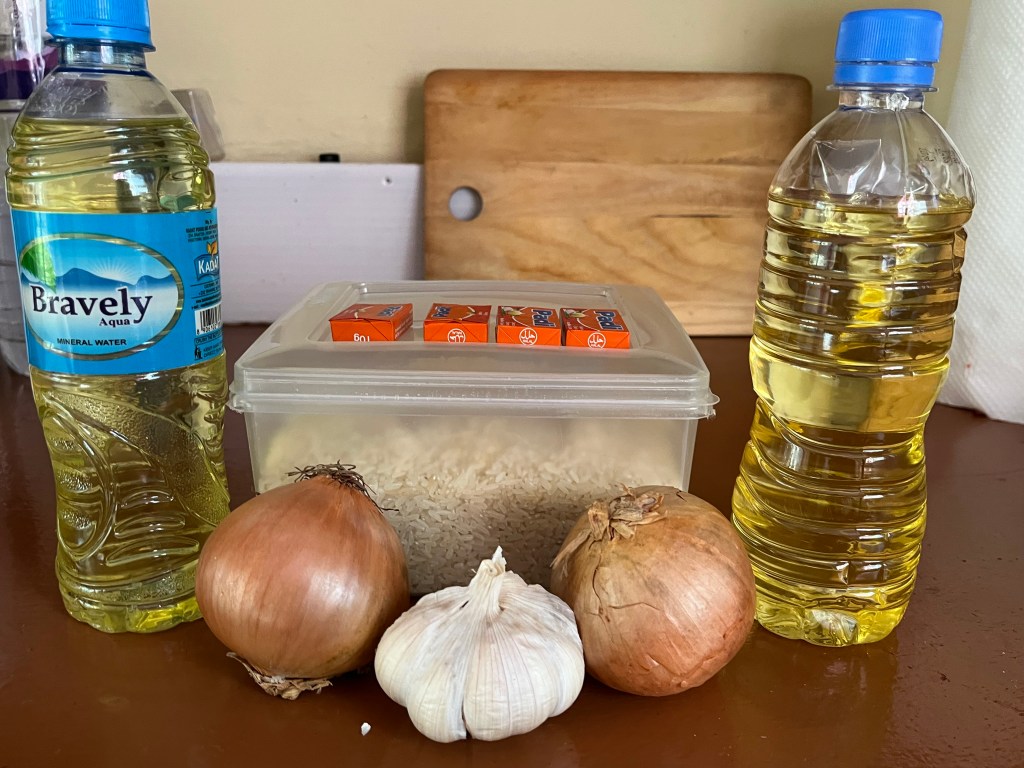 Ein Essenpaket sollte aus Reis, Öl und Gewürz (Brühwürfel) bestehen und wenn es noch reicht, dann ein paar Zwiebeln dazu.