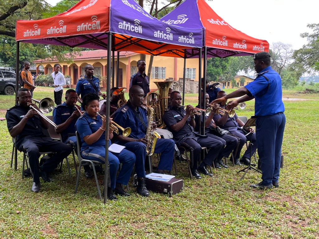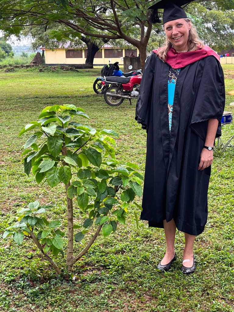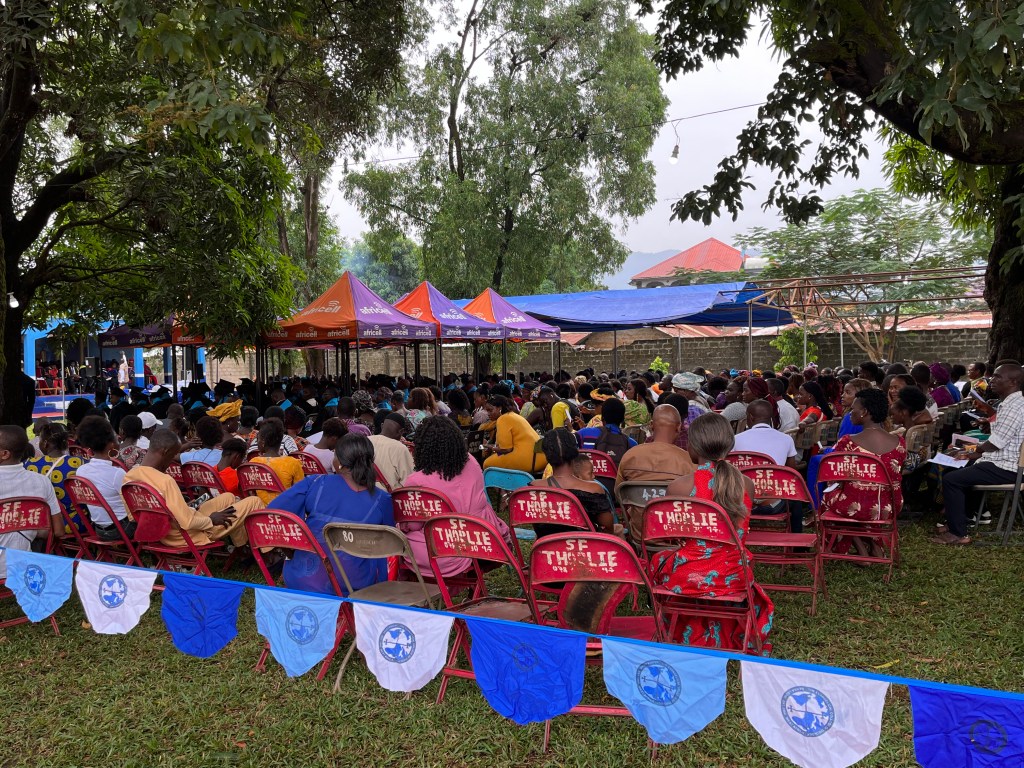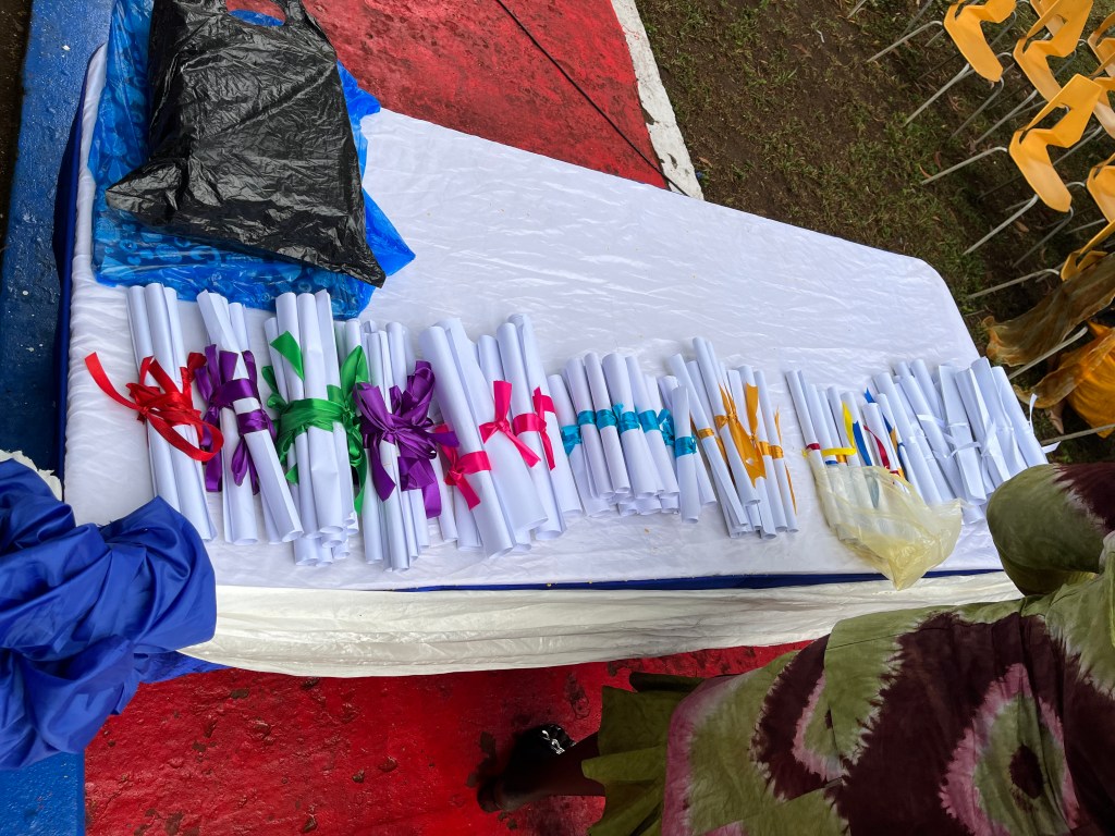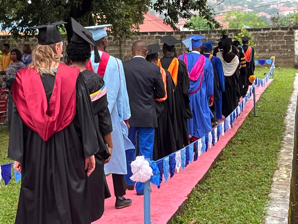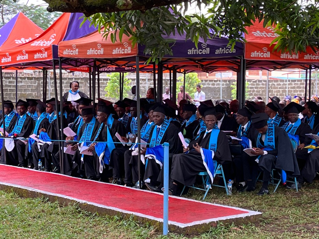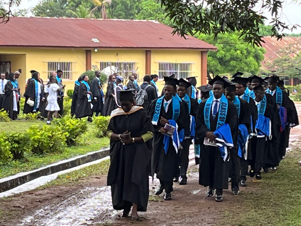Die Graduierungsfeier sollte um 10 Uhr beginnen (afrikanische Zeit). Da diesmal auch ein Minister und zudem offizielle Vertreter der staatlichen Uni erwartet wurde, wäre es losgegangen, sobald er da ist. Aber der Regen machte allen einen Strich durch die Rechnung. Die Technik (Verstärker, Mischpult etc.) wurde ungeschützt im Regen zum Open Air Veranstaltungsort gebracht. Dort war sie jedoch unter einem Pavillon geschützt. Erstaunlich – sie ging noch! Gegen 10.30 Uhr war der Boden zwar noch patschnass, aber von oben kam nichts mehr.