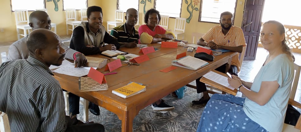 Der Umgang im Unterricht war auch hier von Wertschätzung und Respekt geprägt. Wir lernten einander etwas kennen und diskutierten über unseren Umgang mit der Bibel. Wichtige Punkte wiederholte Christina immer wieder, um sie in Erinnerung zu rufen. Wir sprachen über magische Praktiken (hier durch die traditionellen Geheimgesellschaften weit verbreitet), über kulturelle Unterschiede, über die Menge an Wasser, die benötigt wird, damit eine Taufe gültig ist, über eine gute Predigtvorbereitung und über die Ausbeutung Afrikas durch die Kolonialmächte. Die Studierenden amüsierten sich über Christinas Reaktion auf eine Kuh, die einfach neben unserem Unterrichtsraum an ein kleines Bäumchen angebunden war, um grasen zu können. Als die Kuh weiter wollte, schrottete sie fast das Bäumchen, weil sie stärker war. Hier ganz normal. Für Christina echt spannend.