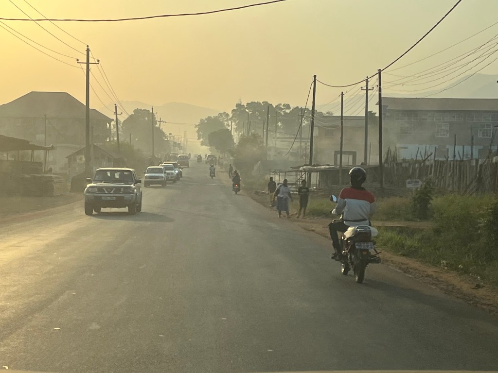 In der Harmattan-Zeit herrscht fast den ganzen Tag eine Brise – die tagsüber durchaus heiße Luft, und wenn es sich abkühlt, eher kühle Luft mit sich führt. Aber was die Winde noch mitbringen ist Staub oder Wüstensand. Wenn Ralf morgens Nathanael zur Schule fährt, hängen Staub und Dreck wie eine Dunstglocke über dem Land. Je höher wir nach Freetown reinkommen desto besser wird die Sicht. Kommt dann die Sonne mehr raus, wird alles klarer.