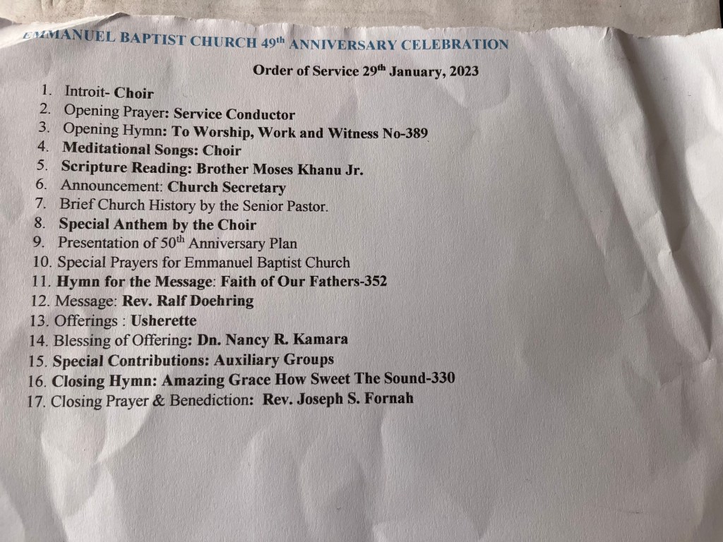 Mitte Januar, als wir den Wagen vom Präsidenten überreicht bekommen haben, erzählte er uns nebenbei, dass sie als Gemeinde (Emmanuel Baptist Church) am 29.01. ein großes Fest feiern werden – das 49. Gemeindejubiläum. Also im Prinzip ein besonderer Gottesdienst. Eine große Sache, so ein Jubiläum, und wir konnten Stolz, Freude und Dankbarkeit für das Bestehen und den Anlass deutlich wahrnehmen.