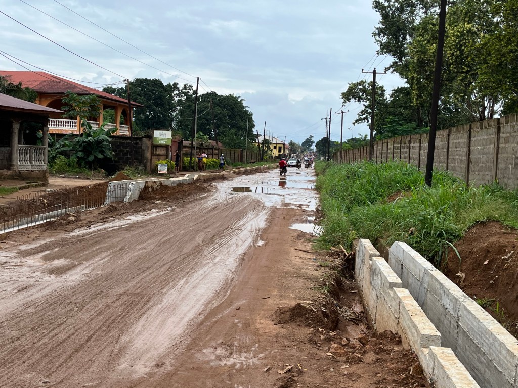 Es wird so gebaut: Zuerst baut man komplett von hinten nach vorne die Seitenkanalisation und Seitenbefestigung. Es werden also nicht etwa Teilabschnitte fertig gestellt. Durchgehend werden zuerst an den Seiten die Gräben gezogen und dann mit Betonpflöcken Kanäle gezogen und abgedichtet – so ist das hier üblich. Erst wenn das durchgehend vorhanden ist, dann wird die eigentliche Straße aufgeschüttet und asphaltiert.