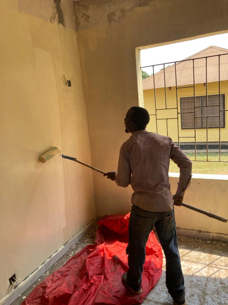 Zu guter Letzt wurden die Studenten mobilisiert, um das Haus von Innen wie Außen mit einem neuen Anstrich zu versehen. Anschließend kam ein weiterer studentischer Hilfstrupp, um das Haus gründlich zu putzen. Bis zuletzt hatten wir so unsere Zweifel, ob das zeitlich hinhauen wird. Aber es ist gelungen! Der Dozent kam am nächsten Morgen und am Abend vorher ist die Putzkolonne abgezogen. Christina hat sich den neuen Fenstern gewidmet, Aufkleber entfernt und sie auf Hochglanz gebracht.