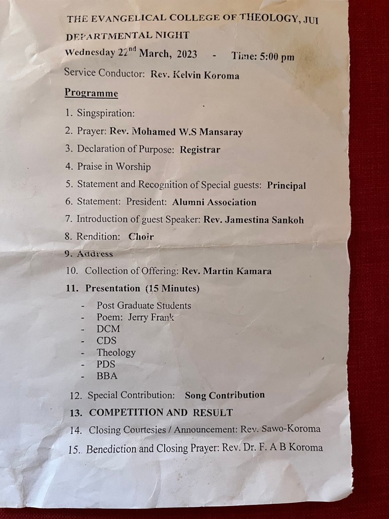 Diesmal wollte das Department der Theologen gewinnen und so setzten sie sich das Ziel 22.000 Leones sammeln und geben zu wollen. Mit dieser Summe, so meinten sie, würden sie klar vorne liegen. In den vergangen Jahren hatten sie deutlich zurück gelegen – dies sollte sich ändern. Wobei man sagen muß, daß die Departments unterschiedlich groß sind. So haben die Theologen eher wenig Leute gegenüber Erziehung und Bildung oder anderen Departments. Und andere haben noch ganz andere Berufe in denen sie arbeiten. So ist es eben ein deutlich finanzieller Unterschied, ob man als Pastor oder als Banker arbeitet. Aber das spielt in der Betrachtung nicht wirklich eine Bedeutung und letztlich geht es um den guten Zweck und ein höheres Ziel!