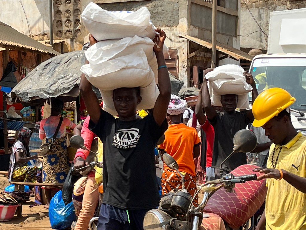 So brachten dann drei junge Männer die 45 x 25 Kg und 2 x 50 Kg Sack Reis durch die schmale Gasse zum Wagen, der damit beladen wurde. Immer zwei manchmal drei Säcke auf dem Kopf … das tut schon beim Zusehen weh. Doch da hier von klein auf alles auf dem Kopf balanciert und getragen wird, sind sie daran gewöhnt. Es sind teilweise wirklich heftig schwere Sachen, deshalb haben die meisten Menschen hier ab einem bestimmten Alter dann auch ständig Kopfschmerzen und/oder Rücken.