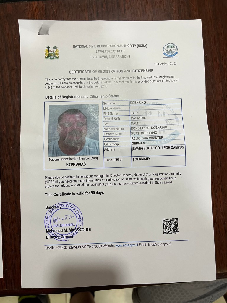 Mitte Dezember gab es in der SLIBS Gruppe das Schreiben vom Ministerium, dass jeder, der in Sierra Leone lebt, eine weitere national ID-Card benötigt und beantragen muss (ähnlich dem Personalausweis). Das ist freiwillig für die Einheimischen. Alle Ausländer jedoch sind verpflichtet, diese Karte zu haben. Mit dieser Karte kann man nicht mehr als mit allen anderen auch – also kein zusätzlicher Nutzen – jedenfalls nicht für die Besitzer.
