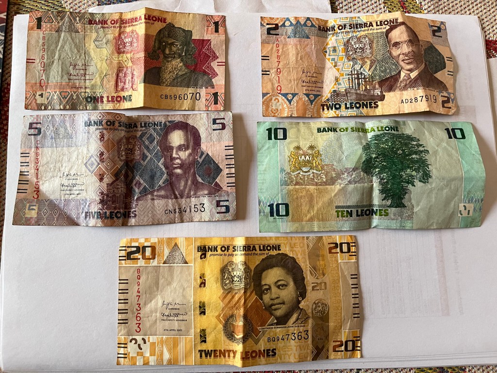In unseren zurückliegenden Monaten haben wir meist größere Summen von der Bank in bar abgehoben – einfach um den zeitaufwendigen Gang nicht zu häufig machen zu müssen. Wir haben stets Scheine erhalten – der größte Schein hat den Wert von 20 Leones, dann gibt es noch 10er, 5er, 2er und 1er – weiter gibt es keine Scheine.