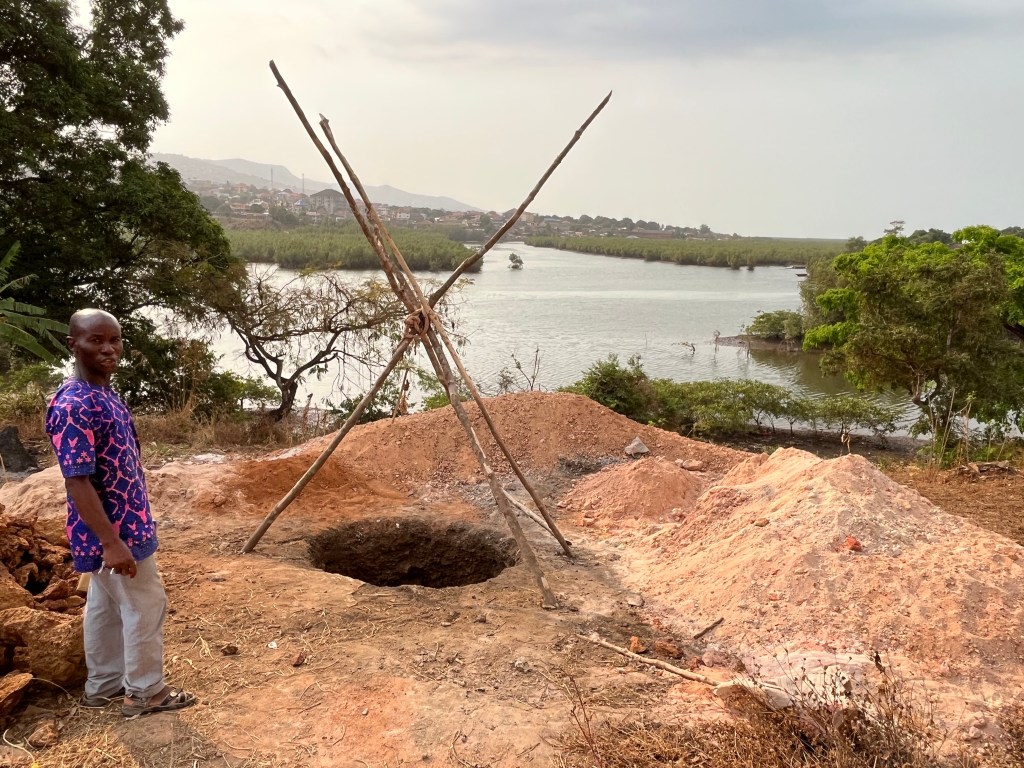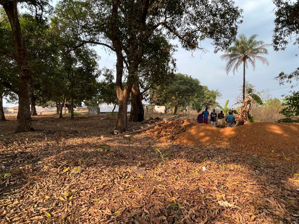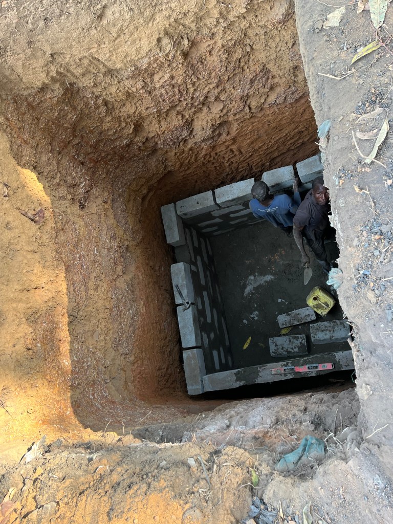 Davor kommen wir immer an der ersten Doppeltoilette vorbei: Ein tiefes Loch, das dort gegraben wird – 15 Fuß tief – in einen harten, teils felsigen Boden. Alles ist Handarbeit. Zwei Arbeiter sind daran beschäftigt. Einer, der mit Spitzhacke und Schaufel gräbt und einer, der den Dreck abnimmt. Man wechselt sich ab.