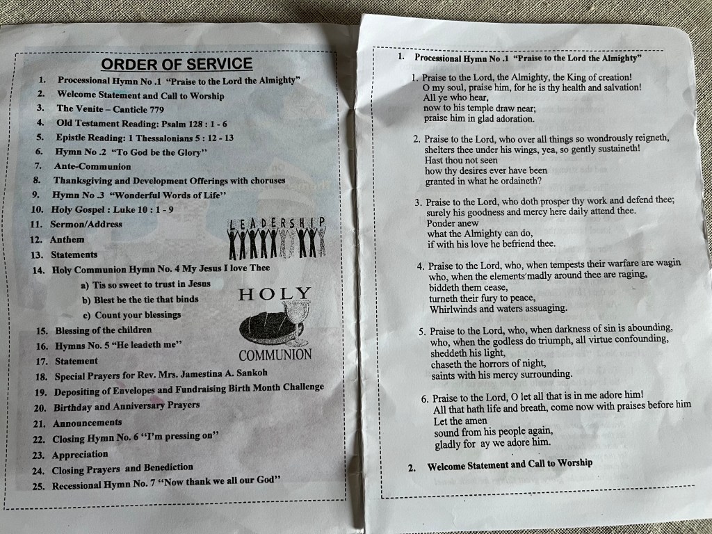 Der Gottesdienst war auf 10 Uhr angesetzt und während die deutsche Vertretung um kurz vor 10 Uhr anwesend war, fing der Gottesdienst natürlich erst mit etwas Verspätung an. Im Verlauf des Gottesdienstes plätscherten nach und nach immer mehr Besucher und Gäste ein, so dass es am Ende sehr voll und eng war.