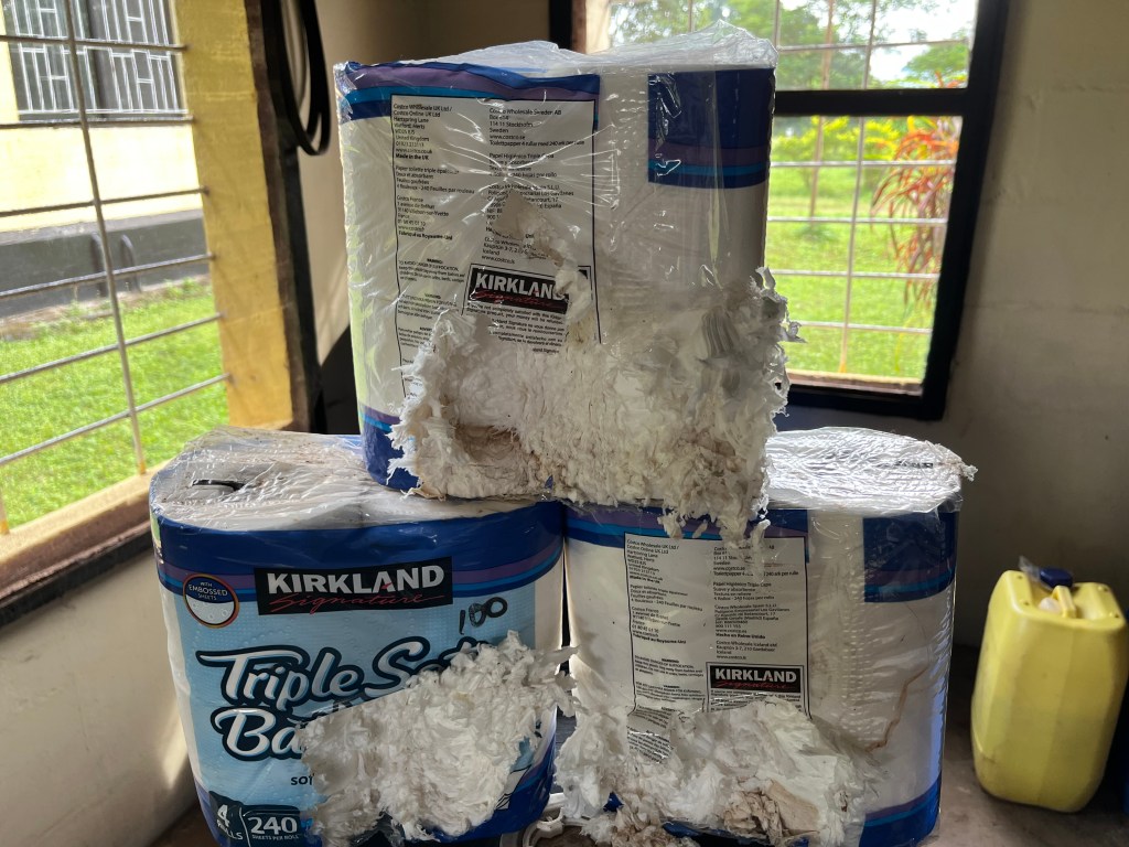 Im Vorfeld schickte der Prinzipal Fotos, darauf mehrere Packungen unseres Toilettenpapiers. Jede Packung war aufgebissen und jede Rolle angeknabbert – „ihr scheint Ratten im Haus zu haben“, meinte er! Na super! Und jetzt??