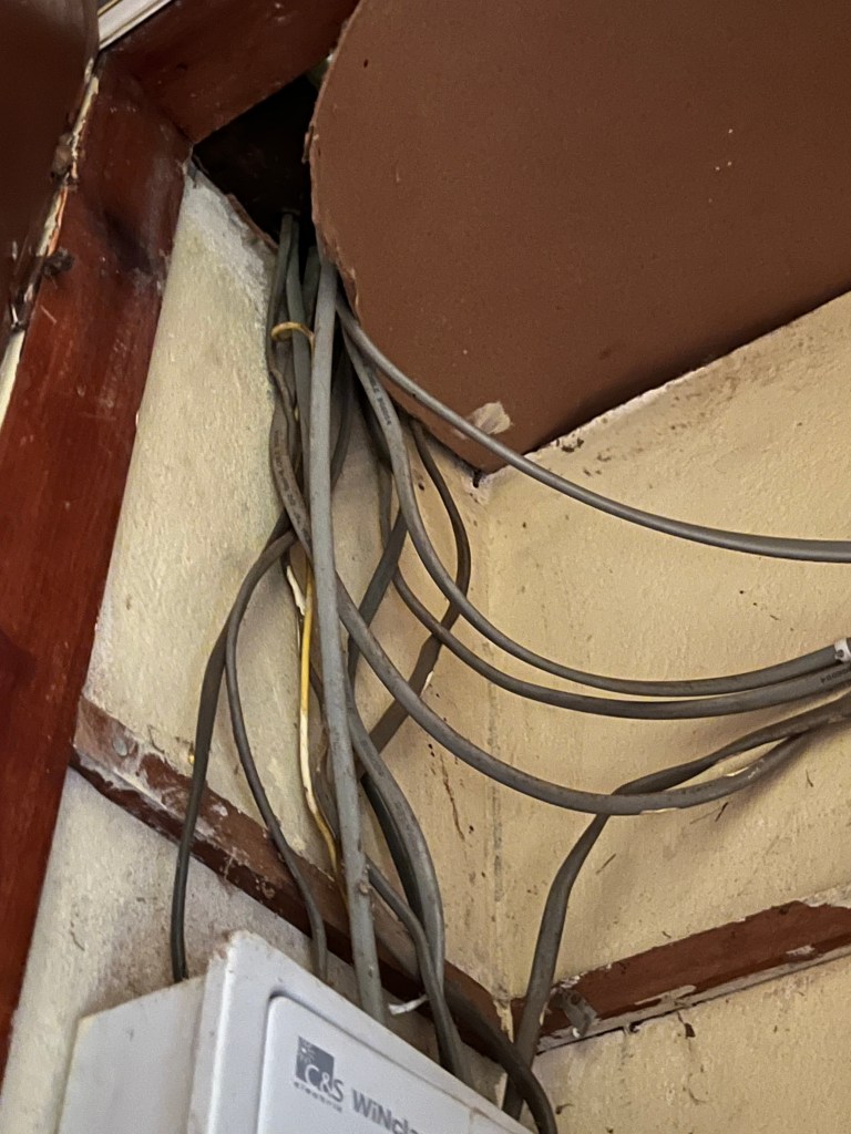 Im Bad ist ein Schrank und über das Dach kommen Leitungen zum Schaltkasten für Warmwasser und Strom. Dieser Durchgang ist nicht ganz geschlossen und so können von dort ungebetene Gäste zumindest diesen Schrank aufsuchen – was sie getan haben. Genau dort stand das Klopapier.