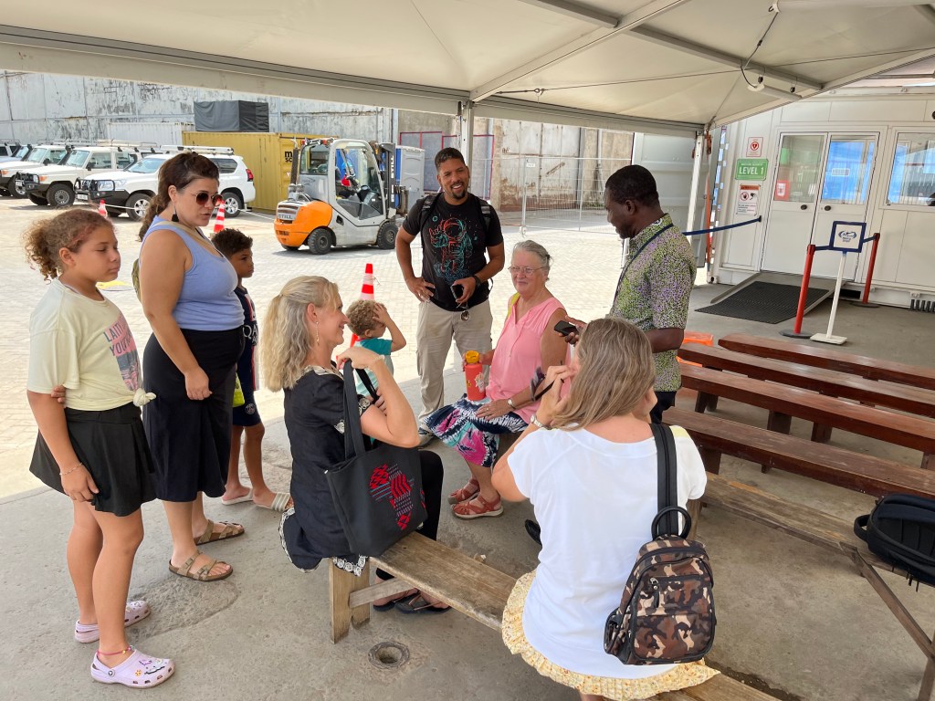 Aufgeregt und pünktlich waren wir schließlich im Empfangsbereich vor dem Schiff. Als alle da waren, wurden wir von Pastor Koffi Govi-Dankqo aus Benin in Empfang genommen. Er arbeitet als Geistlicher auf dem Schiff und war unser Tourguide. Er ist mittlerweile schon viele Jahre mit Mercy Ships im Dienst.