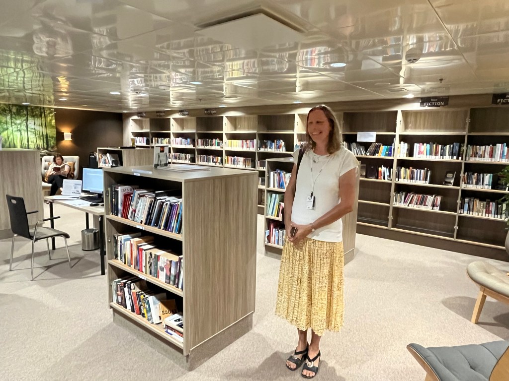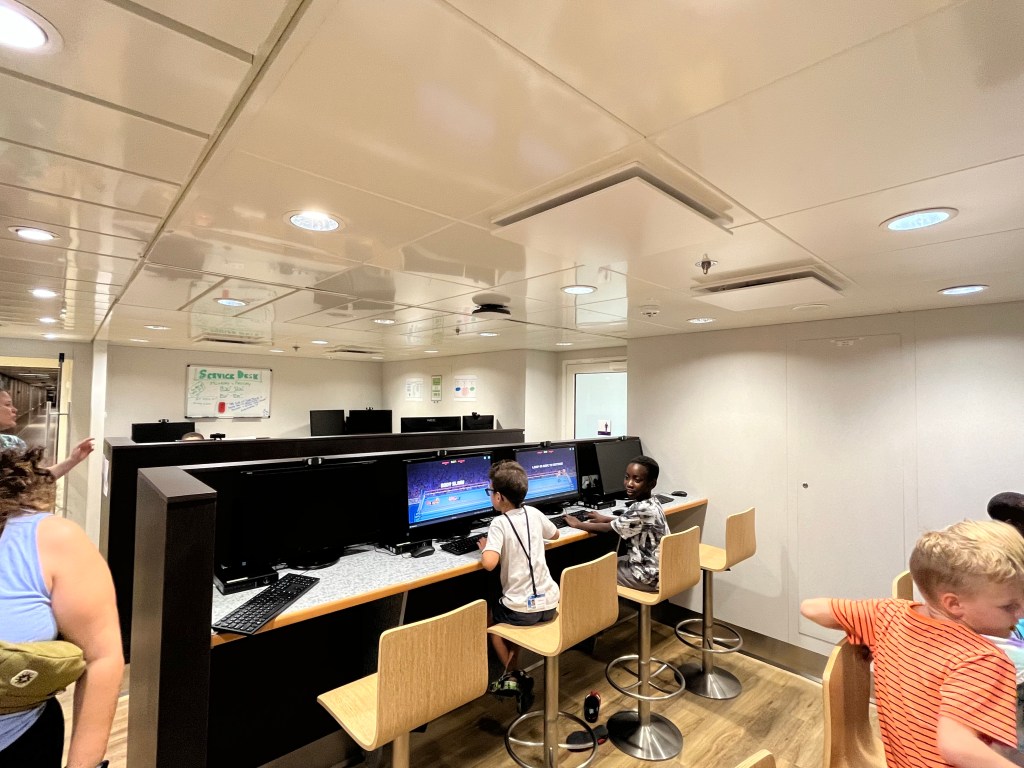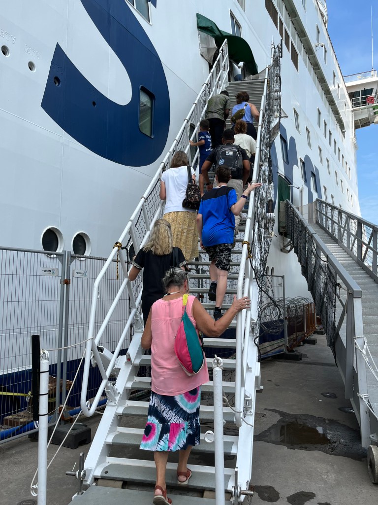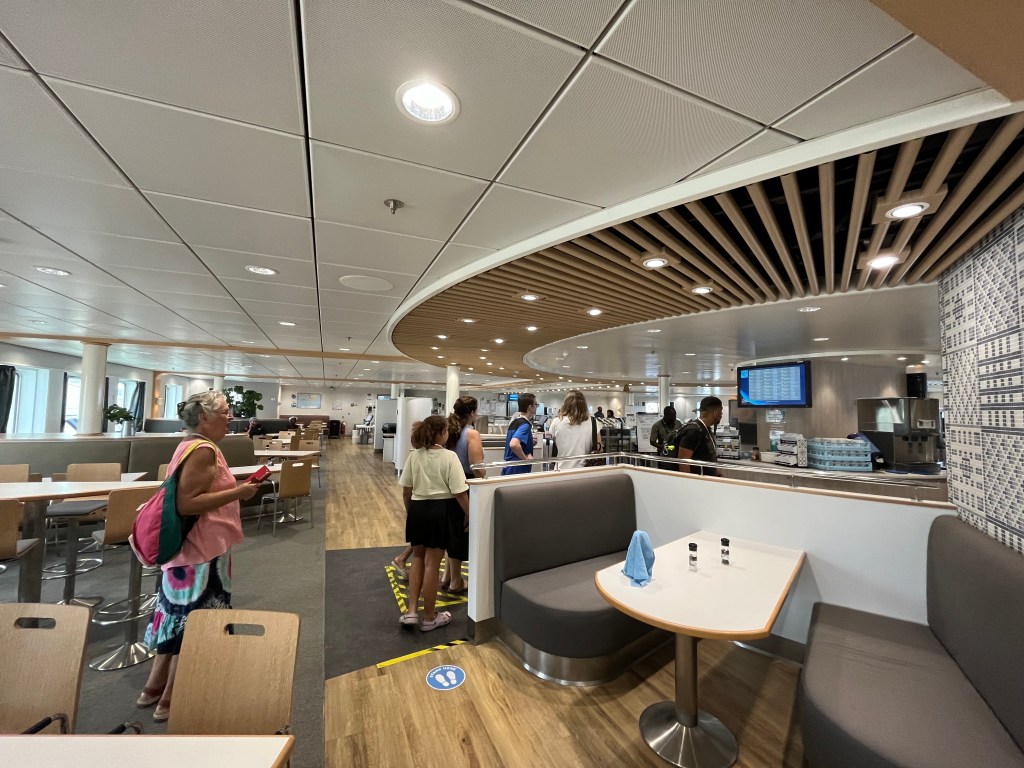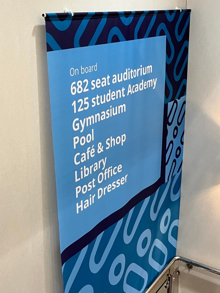 Zuerst mussten wir durch die Sicherheitsschleuse – jeder sollte seinen Reisepass dabei haben, um sich auszuweisen. Gecheckt wurde, ob die Daten der Anmeldung auch stimmen. Wir erhielten einen Besucherausweis und dann ging es wie beim Traumschiff über die Seitengangway 30 Meter in die Höhe ins Schiff. Dort war die Rezeption und schon da wurde uns das Bild eines topmodernen Hotels vermittelt. Sauber, ordentlich, geradezu großzügig – wie in einer Lobby. Dort erhielten wir einen Selbsttest für Corona, den jeder machen musste. Corona ist nach wie vor vorhanden. Auf dem Schiff wäre ein Ausbruch fatal – Krankenhaus eben.