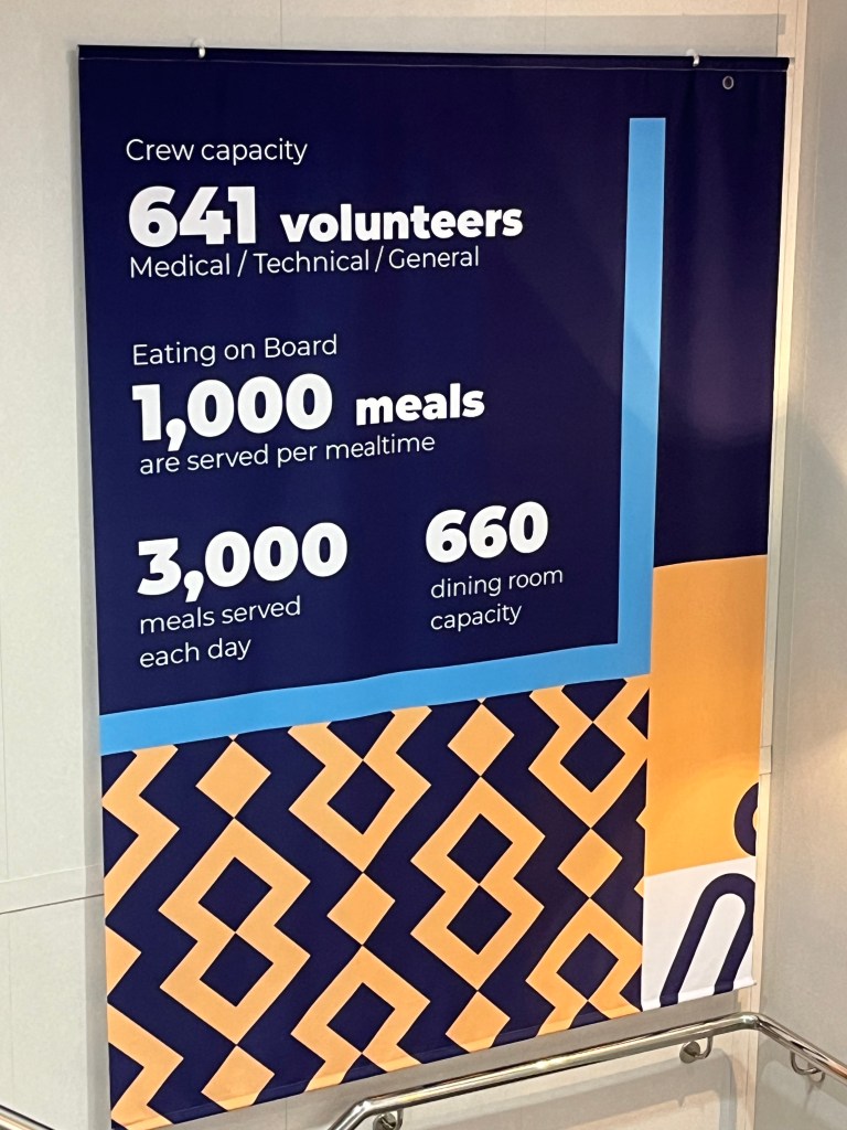 Insgesamt können über 600 Personen auf dem Schiff leben und arbeiten. Im Moment sind es um die 400 Personen – also unterbesetzt. Gerade Krankenschwestern werden dringend benötigt und gesucht – aber auch in anderen Bereichen werden Mitarbeiter bzw. Freiwillige gesucht.