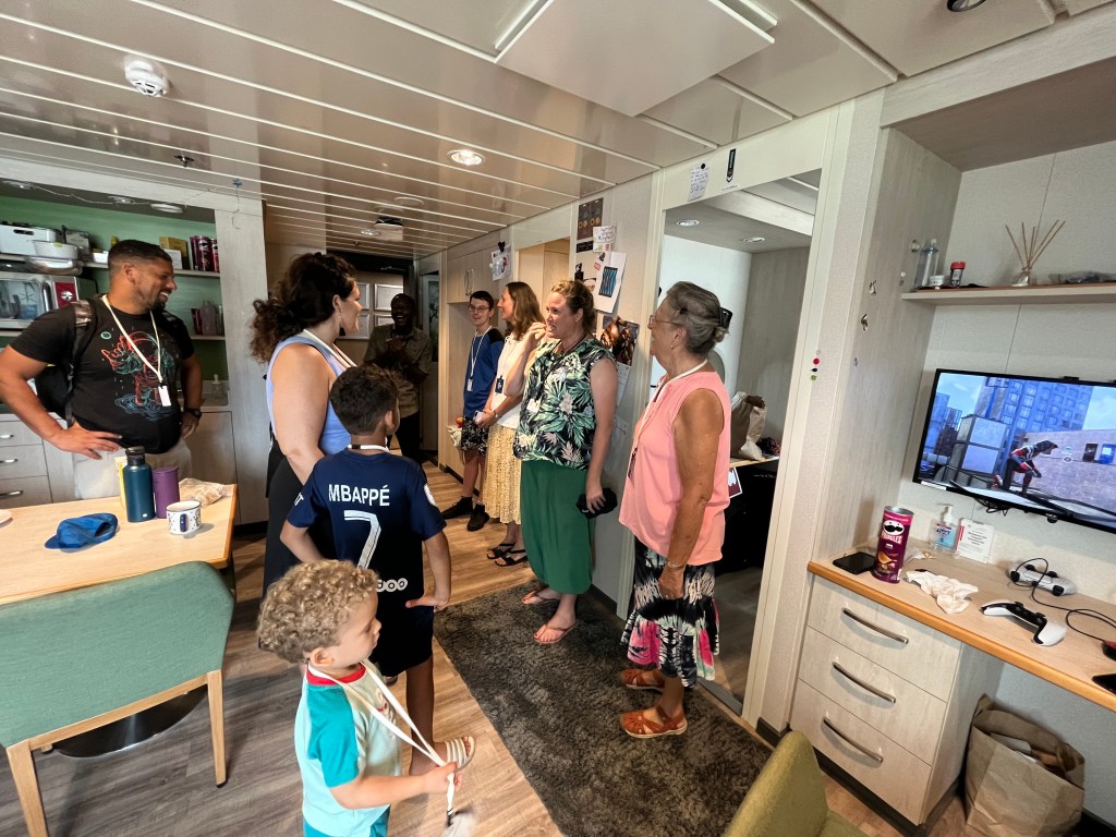 Als wir durch einen der Flure liefen, an deren Seiten die Zimmer der Mitarbeiter abgingen – öffnete sich eine Tür und wir wurden kurzerhand in den persönlichen Wohnbereich einer fünfköpfigen Familie eingeladen – super! Denn wie lebt man auf dem Schiff? Klar, es ist keine riesige Wohnung. Aber dort ist deutlich mehr Platz als gedacht. Kleine Küchenzeile im Raum mit gemütlichen Wohnzimmercharakter – Schlafzimmer – Bad – zwei kleine Kinderzimmer etc. Es war deutlich anders als wir uns das vorgestellt hatten.
