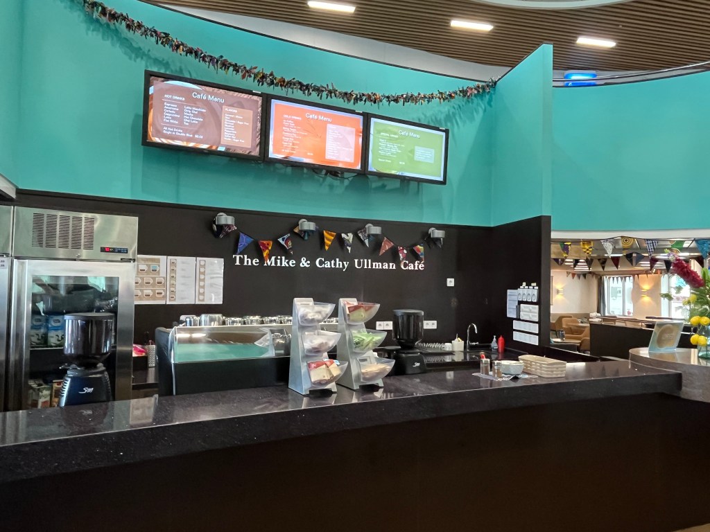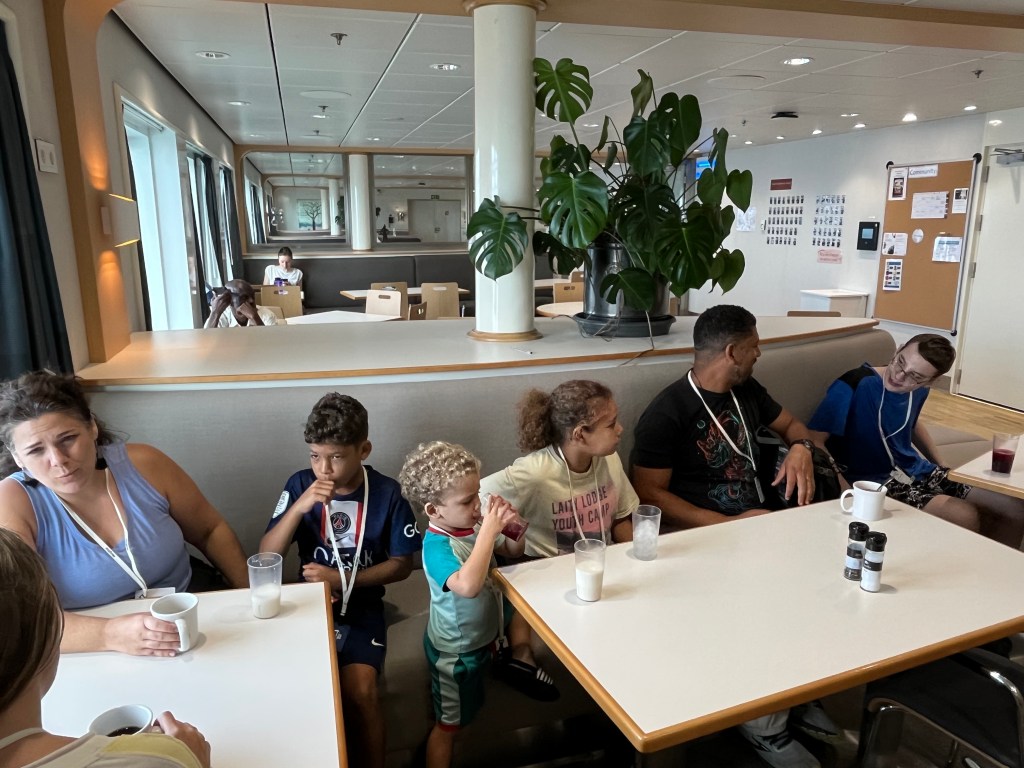 Eine große Cafeteria – ein Speisesaal. Das Essen gibt es zu bestimmten Zeiten, aber durchgehend kann man dort Kleinigkeiten zum Essen oder Trinken besorgen und sich einfach mal etwas zurückziehen. Unter der Woche ist das volle Leben dort, am Wochenende deutlich entspannter – wir waren beeindruckt und manch einer konnte gar nicht genug von der „richtigen“ Milch bekommen, die es dort umsonst zu nehmen gab!