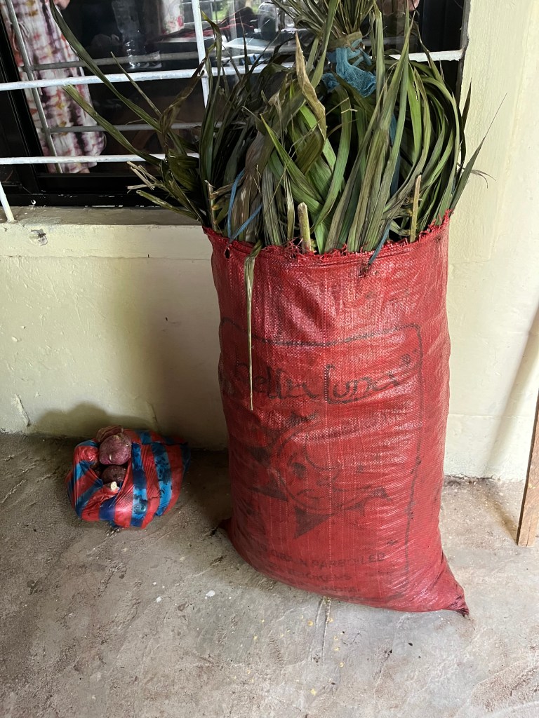 Er öffnete die Kofferraumtür seines Pickups und holte zwei Papayas, eine Tüte voll mit Süßkartoffeln und einen größeren Sack heraus, das alles will er uns zukommen lassen – wow. Diese größeren Säcke kann man überall auf den Wegen und Straßen transportiert sehen. Weil da immer grüne lange Blätter heraushängen, dachten wir bisher, das sind Casavablätter (die kann man auch essen).