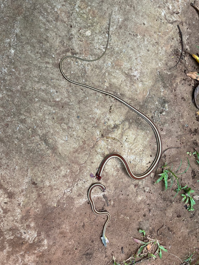 Mit einem gezielten Schlag auf den Kopf fiel das Tier auf den Boden, dort mit dem Stock festhalten und dann in zwei Hälften getrennt. Es ist uns bekannt, daß wenn man Hühnern den Kopf abschlägt, der ganze Körper noch einige Zeit rumrennt. Bei Schlangen war uns das neu.