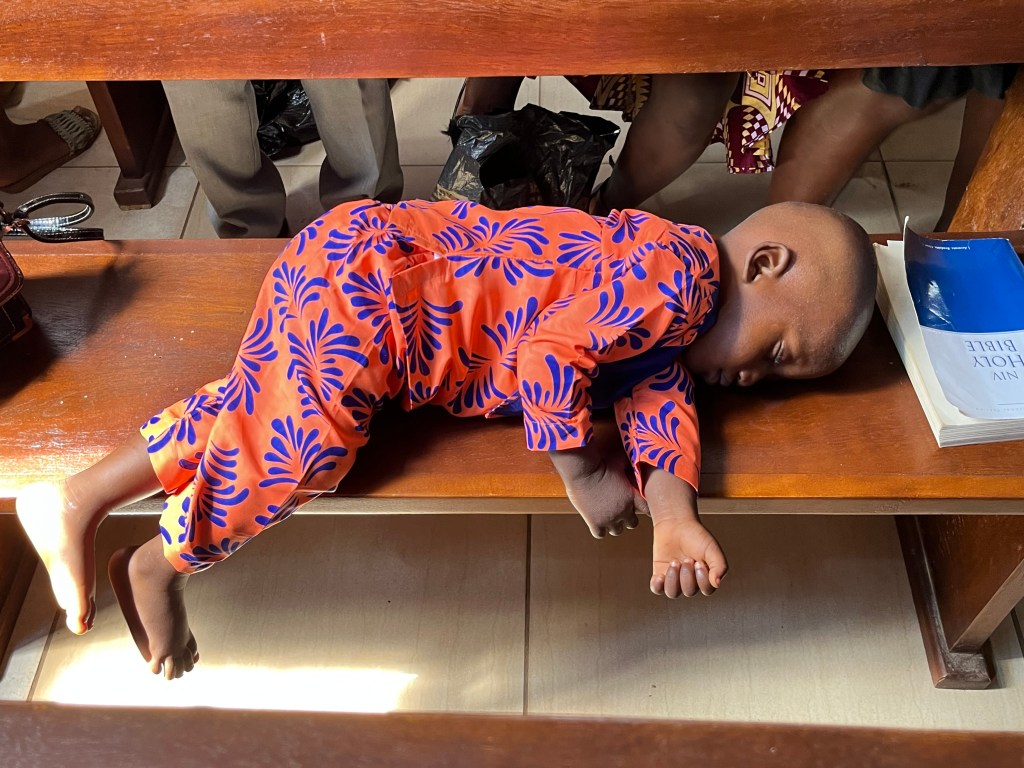 Gibrilla, sein Freund, wohnt in Calaba Town, wo auch die Peace Baptist Gemeinde lokalisiert ist. Er hatte mal was mit Christsein zu tun, aber durch etliche Rückschläge – er ist Taxifahrer mit Bike – hat er das aus den Augen und Herz verloren. Über Emmanuel hat er Christina kennengelernt, die regelmäßig für seine schwierige Situation betet. Da wir ihn gelegentlich unterstützt haben, wollte er gerne die Peace Baptist besuchen, was er zusammen mit seinem kleinen Sohn machte.