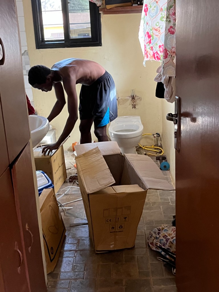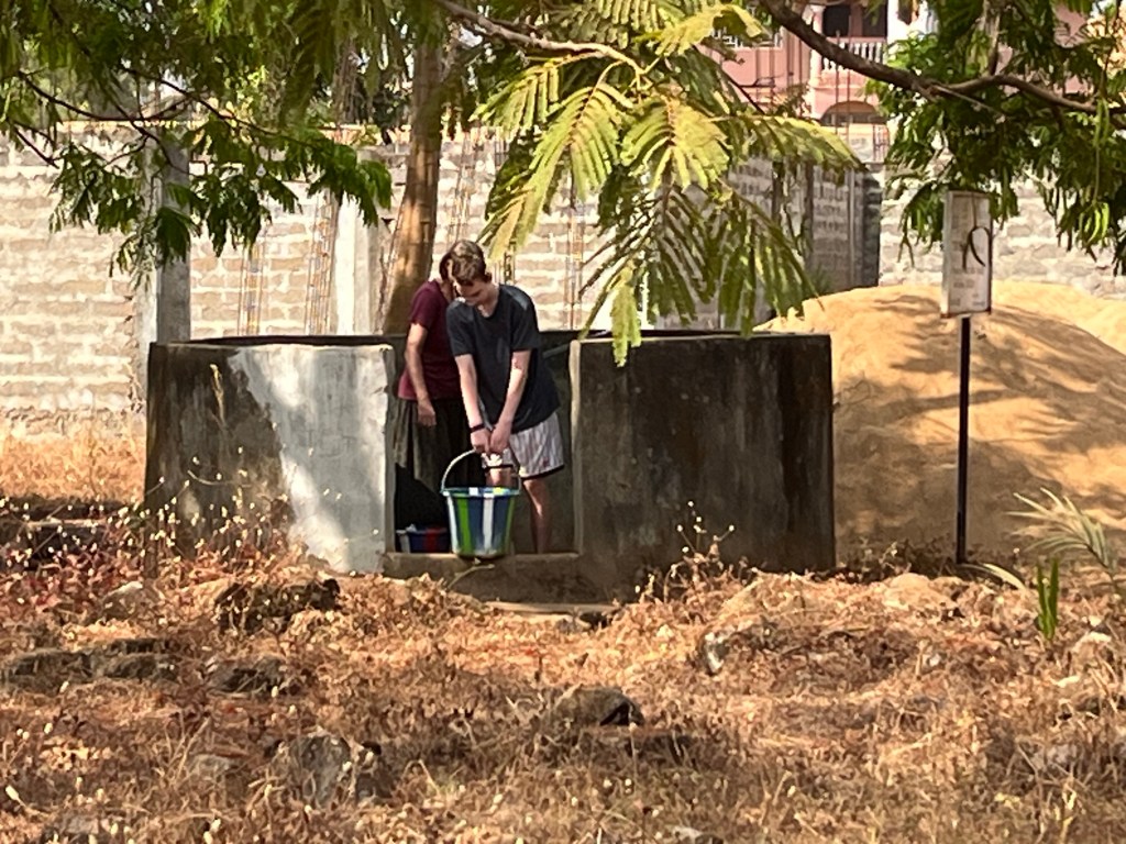 Also machten wir uns auf den Weg, bewaffnet mit Putzeimern, zum nächsten Brunnen. Als wir anfingen Wasser zu pumpen, kamen aus dem Mädelswohnheim vier junge Damen auf uns zugelaufen. Sie teilten uns mit, dass sie das für uns machen! Wir wollten eigentlich nicht, aber das geht hier gar nicht. Also pumpten sie und trugen dann auch die randvollen schweren Eimer auf dem Kopf (wie das hier so Art ist) zu uns.