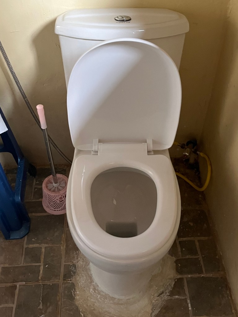 Nach zwei Stunden war sein Gehilfe samt Toilette da. Der Gehilfe hatte sie unterm Arm auf einem Moped transportiert. Nun fingen sie mit dem Abriss und Einbau an. Nach weiteren 1,5 Std. war alles erledigt – der neue Thron stand fix und fertig. Jetzt noch zwei Stunden nicht nutzen – trocknen lassen. Dann konnten wir gegen 20 Uhr die Inthronisation vornehmen – ein gutes Gefühl.