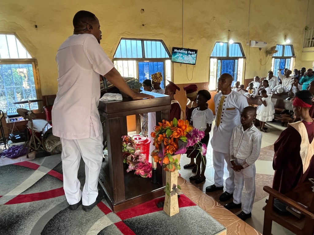 So warteten wir. Gegen 10.20 Uhr fing dann der Chor an und wollte nach dem Lobpreis schon aufhören, doch Pastor Abu ermutigte sie weiter zu singen – solange, bis dann der junge Prediger eintraf – gegen 10.45 Uhr. Er kam in Begleitung seiner Frau, welche seine Bibel hinter ihm hertrug und ihm vorne übergab. Was für ein treusorgendes Eheweib. Sie tauschte sogar während der Predigt sein Schweißtuch aus – interessant.
