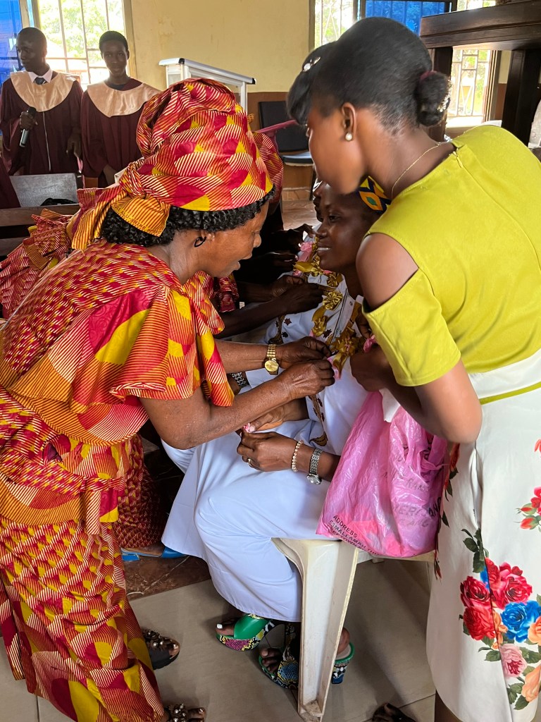 Dann nahm das Pastorenehepaar vorne Platz und die Gemeinde hatte nun die Gelegenheit Geldbeträge zu spenden. Dafür erhielten sie Schleifen und diese konnten sie der Pastorenfamilie anheften. Das ist hier ein sichtbares Zeichen von Dankbarkeit und Geben.