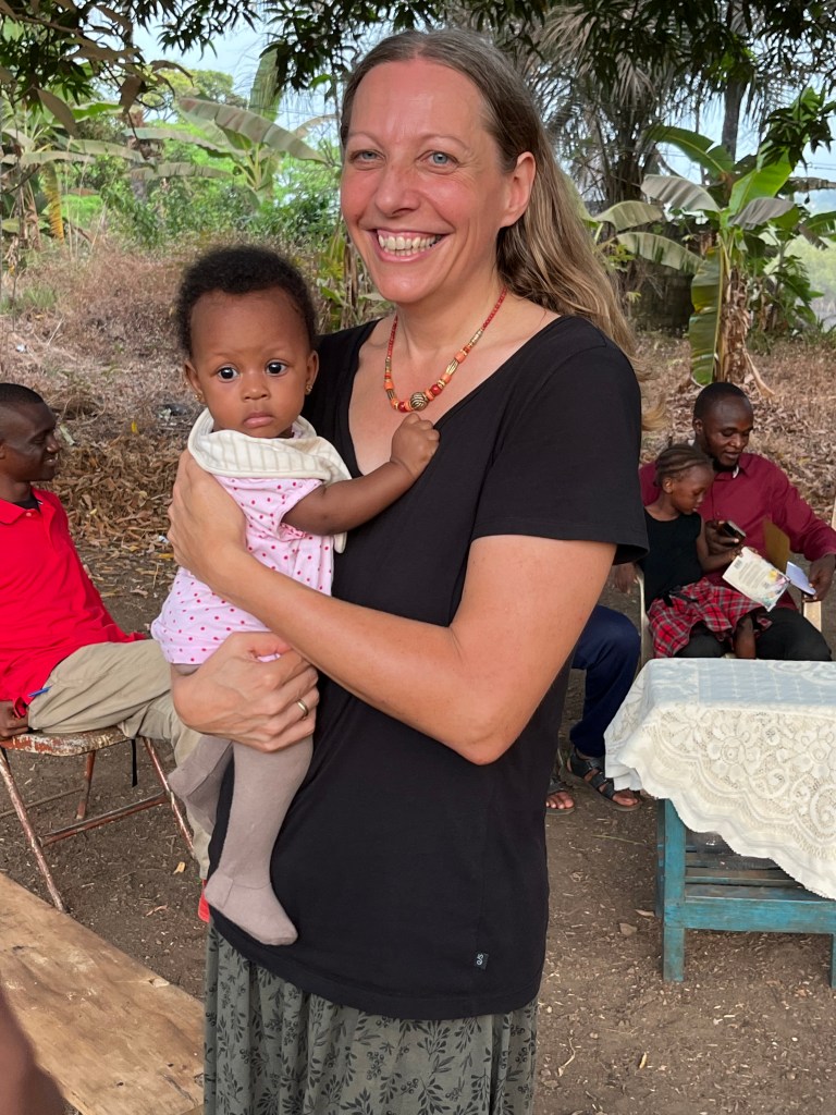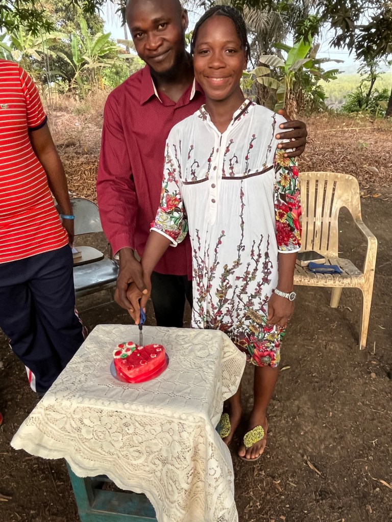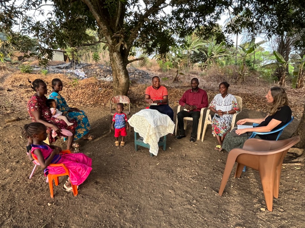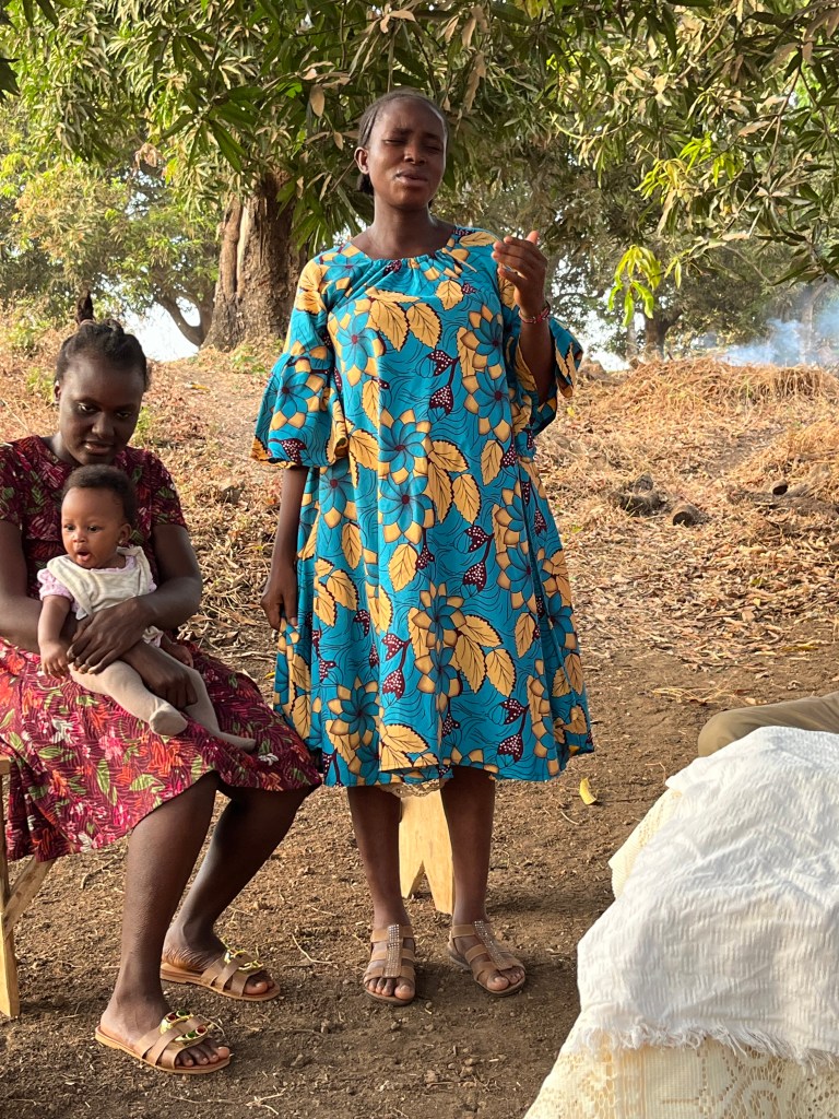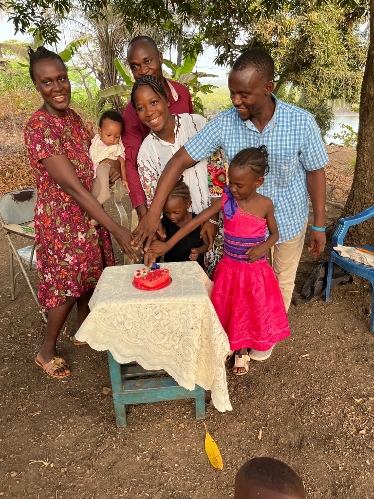 Als wir dort ankamen, hatten sie unter dem Mangobaum einen kleinen Stuhlkreis aufgebaut. Nicht nur wir, auch Familie Smart (Nachbarn) und die Familie von Dozentin Alina waren eingeladen und dann noch ein Freund und Studienkollege von Momoh. Der sollte durch die Veranstaltung führen – sie haben hier für wirklich alles einen Ablauf. Nach einer kurzen Begrüßung und Vorstellung vom Studienkollegen durfte Pastor Ralf das Eingangsgebet sprechen.