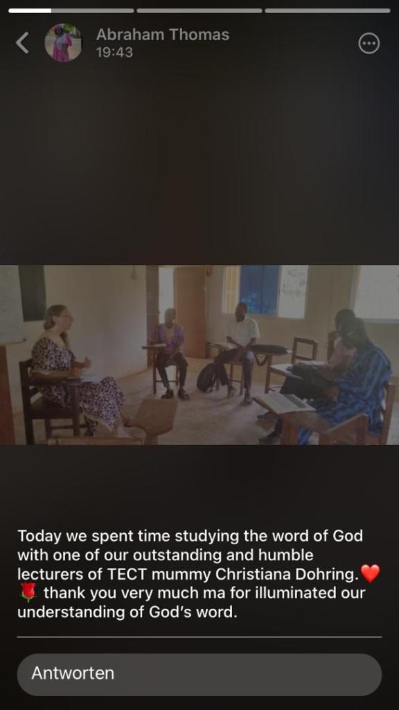 Aber wie immer: Gott ist in allem und leistet Maßarbeit – darüber dürfen wir staunen! Als wir Santigie und seiner Frau die Verpflegung überreichten, waren sie „sprachlos“ – kommt bei Santigie nicht häufig vor. Er ist einfach lebensfroh, unglaublich positiv und talkative! Die beiden schauen sich an und dann erzählt Santigie, dass vor zwei Wochen drei junge Frauen vom T.E.C.T. auf sie zugekommen sind und gefragt haben, ob sie bei der Familie unterkommen können.