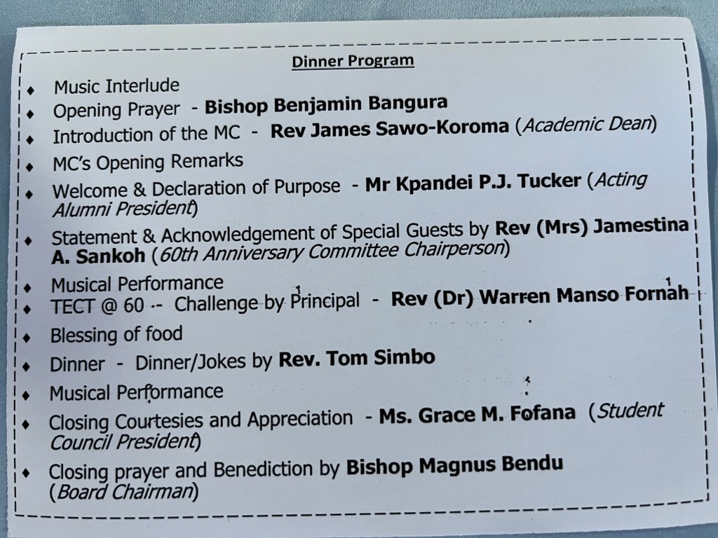 Allerdings hatten auch die Dozenten und Mitarbeiter vom T.E.C.T. Anwesenheitspflicht und durften ein Ticket erwerben. Es gab vier Kategorien: Bronze – Silber – Gold – Platin. Der Unterschied lag in der Höhe des Geldbetrages und am hergerichteten Sitzplatz. Je nach Ticket saß man dichter oder weiter weg von der Bühne. Auch die Reihenfolge, wann man Essen holen durfte, hing daran, wie viel man gezahlt hatte. Von uns wurde natürlich das Platinticket erwartet und so zahlten wir dann 2.800 Leones (ca. 130 Euro) für zwei Tickets.