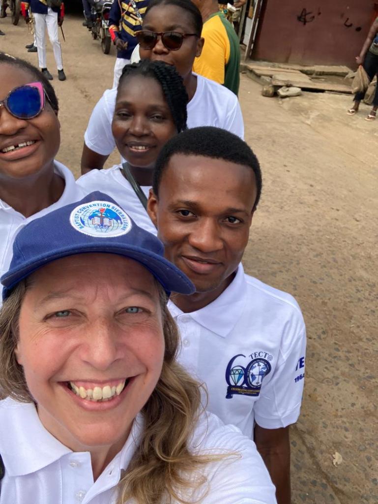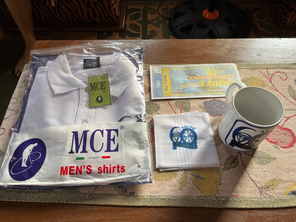 Das Wetter war genial. Kein Regen (wie angekündigt), aber dichte Wolken, so dass die Sonne nicht unbarmherzig brannte, sondern es für hiesige Verhältnisse angenehm kühl blieb. So zogen der Sonderzug schließlich fröhlich auf dem T.E.C.T. Gelände ein. Etliche Personen wurden hoch leben gelassen, es war ausgelassene Stimmung unter den Studenten. Vor dem Hauptgebäude wurden anschließend zwei Flaggen gehisst: Unter Singen der Nationalhymne zunächst die Flagge von Sierra Leone und dann noch die Jubiläumsfahne des T.E.C.T. mit einem Lied, welches vor etlichen Jahren der deutsche Missionar und Pastor Albrecht Gralle getextet hatte, als er hier arbeitete. Es ist das offizielle T.E.C.T. Lied. Anschließend gab es noch ein paar warme Worte, Gebete und zuletzt die Aufforderung, morgen pünktlich zum Festgottesdienst um 14 Uhr zu erscheinen … 100 Leones Haben oder nicht Haben!