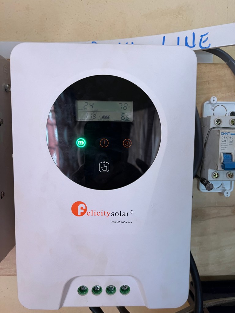 Ralf fragte, ob es möglich ist, die Anlage zu erweitern, wenn wir Bedarf sehen – also weitere Panels oder Batterien anzuschaffen? Ja das ist möglich! Die Panels, so kamen wir überein, sind allerdings bereits ausreichend. Die sechs, die auf dem Dach angebracht sind, laden von morgens 7 Uhr (wenn die Sonne aufgeht) bis 17.30 Uhr abends (wenn die Sonne untergeht). Die stärkste Zeit des Aufladens liegt im Bereich zwischen 11 – 16 Uhr und das ist mehr als die beiden Batterien aufnehmen können. So entschieden wir uns kurzerhand, noch eine weitere Batterie zu besorgen – damit haben wir nun gute 10 – 12 Stunden Strom (wahrscheinlich noch mehr) und können auch tagsüber Engpässe überbrücken. Nach einer kompletten Nacht auf Solar (Ventilatoren, Internet, Kühlschrank, Außenlichter) läuft morgens sogar noch unsere Kaffeemaschine darüber, ohne dass die Anzeige meckert.