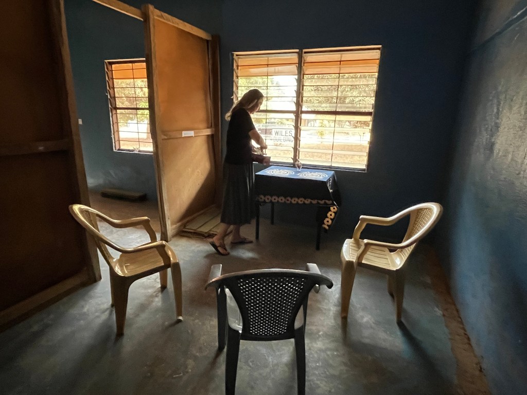 Mit der Hilfe von zwei Studenten wurde der Raum gereinigt und möbliert. Der Campuselektriker hat die Lampen instand gesetzt und der Ungläubige hat sich auf den Weg gemacht, um zusätzliche Stühle und Tische zu besorgen. Das hat nur drei Tage gedauert bis er unterwegs an einem Straßenstand einen kleinen „Schulschreibtisch“ stehen sah – dieser ziert jetzt den Gesprächsraum. Aus einem anderen Store kamen noch drei Stühle hinzu.