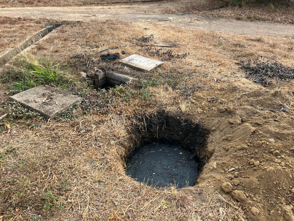 Gegen 19.30 Uhr am Freitag (es war bereits dunkel) kam tatsächlich der Klempner und fing an, die „Sickergrube“ draußen zu öffnen. Also einen abgedeckten Zugang, um in den „Abflusskanal“ steigen und schauen zu können, was oder wo das Problem saß. Es war schnell zu erkennen, dass etwas nicht stimmte: Die Grube war randvoll … und jetzt?