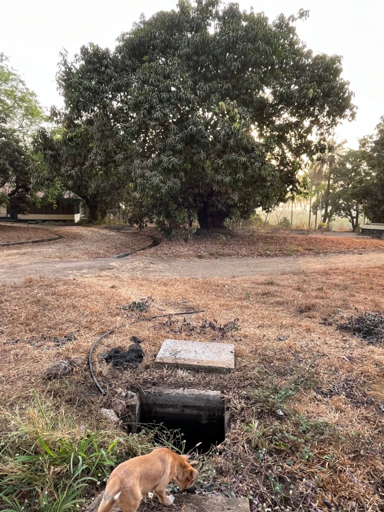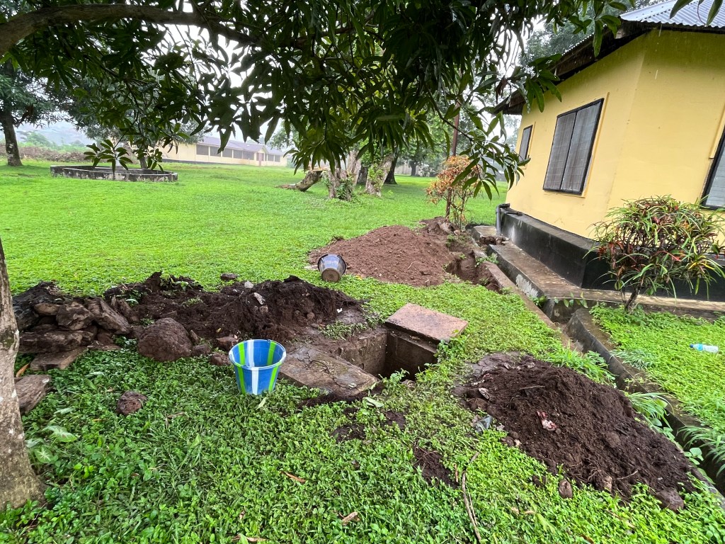 Jetzt ging es ans Saubermachen und Feststellen, dass auch zwischen Grube und Toilette eine Verstopfung war. Wahrscheinlich hatte sich alles vom Mangobaum zurückgestaut, an verschiedenen Stellen verdickt und hing fest. Die Arbeit des Klempners war nicht zu beneiden.