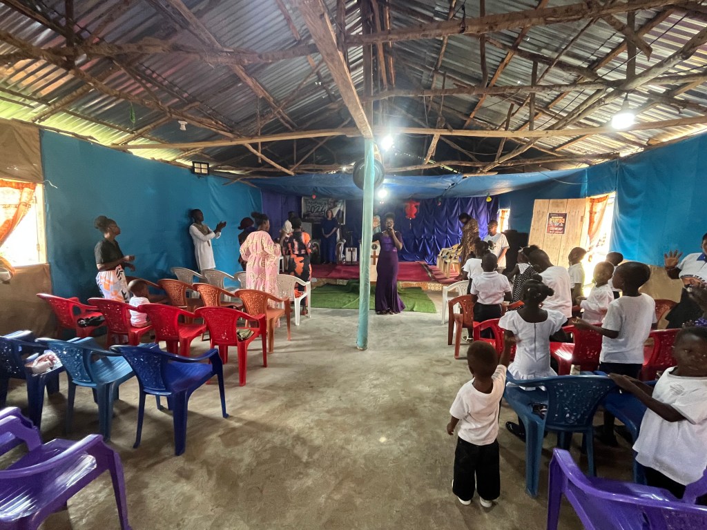 Es ist eine nette kleine Gemeinde in ganz schlichten Verhältnissen – eine sogenannte Blechkirche: Lehmboden, Holzstangen und Wellblechdach. Aber fröhlich, laut und von Gott begeistert. Bunte Tücher, chinesische Papierlampions und eine Diskokugel als Deko. Feine goldbemalte Ledersesselthrone für die VIPs des Gottesdienstes (Apostel, Pastoren, Leiter).
