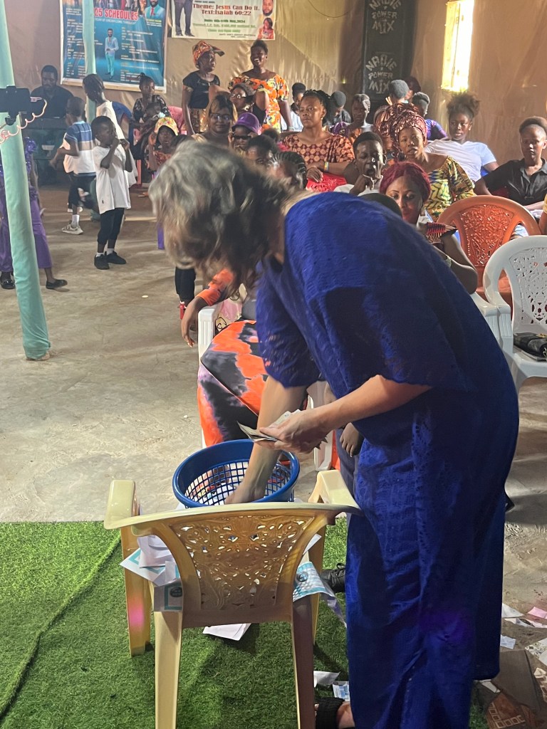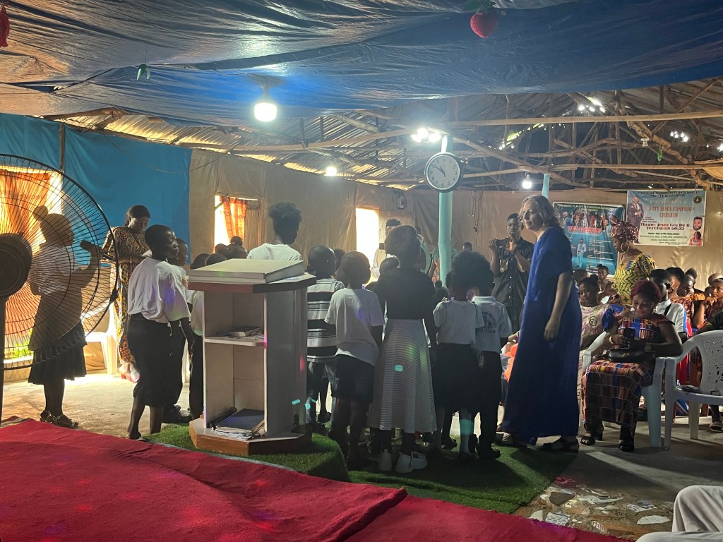 So waren wir an einem Sonntag in Lunsar in einer kleinen Pfingstgemeinde, damit sie dort predigte. Es war ein Kinder Thanksgiving Gottesdienst. Das bedeutet im Grunde Fundraising. Die Kinder üben Bibelverse und Lieder ein, um sie an diesem Sonntag vorzutragen. Eltern und Familie sind eingeladen und quittieren die Leistungen ihrer Kleinen mit Geldgeschenken. Das Geld geht in die Gemeindearbeit.