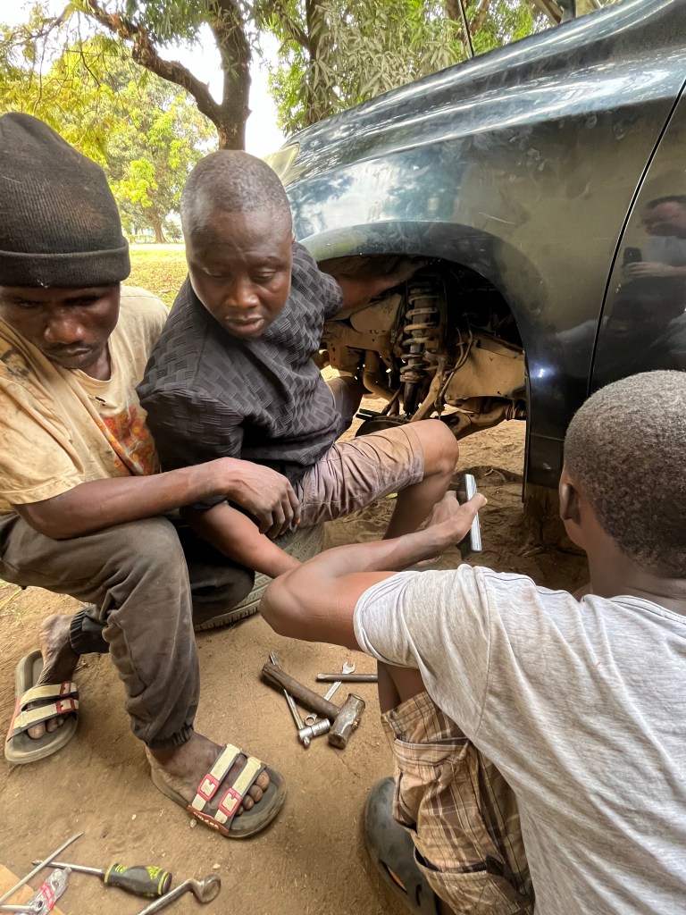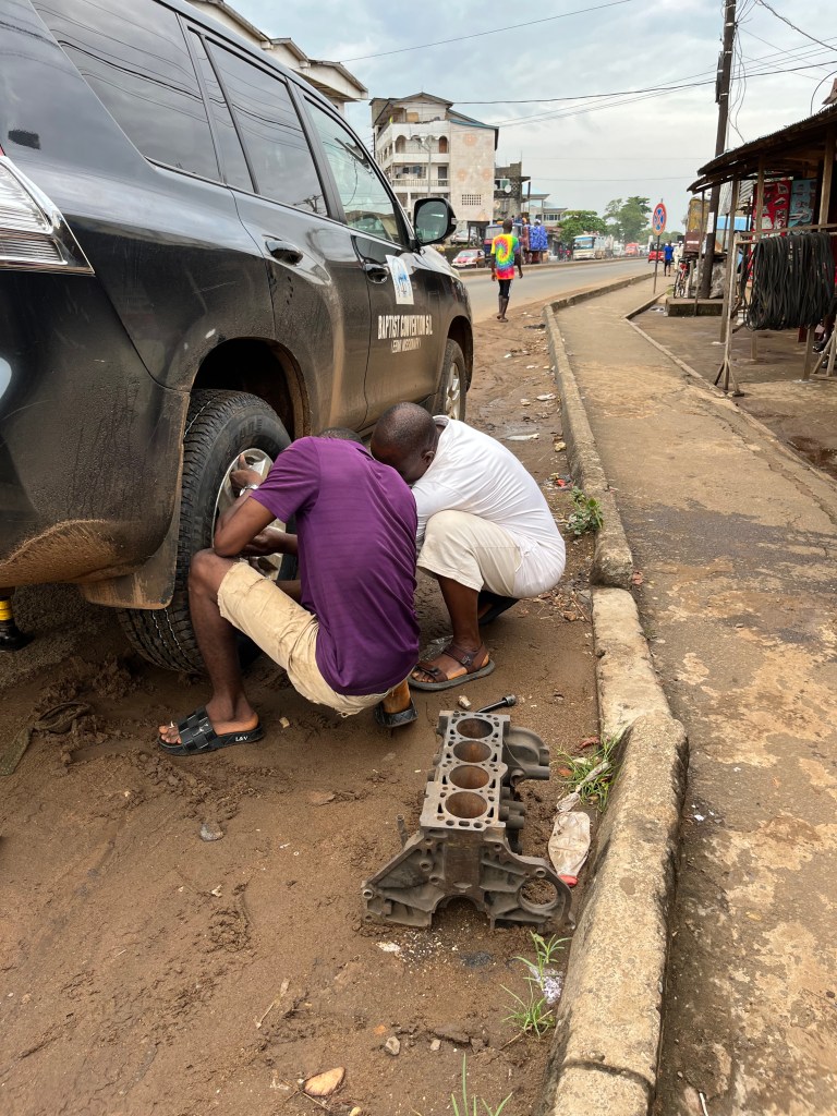 Auch bei den Bremsen konnte Amadu so nichts erkennen – also ab in den Wagen und nach Freetown. Doch wenige Meter weiter auf der Hanga Road, als die asphaltierte Straße begann, hörte Ralf das Schlagen, was immer heftiger wurde und beim Bremsen trat er wieder durch ohne Wirkung.