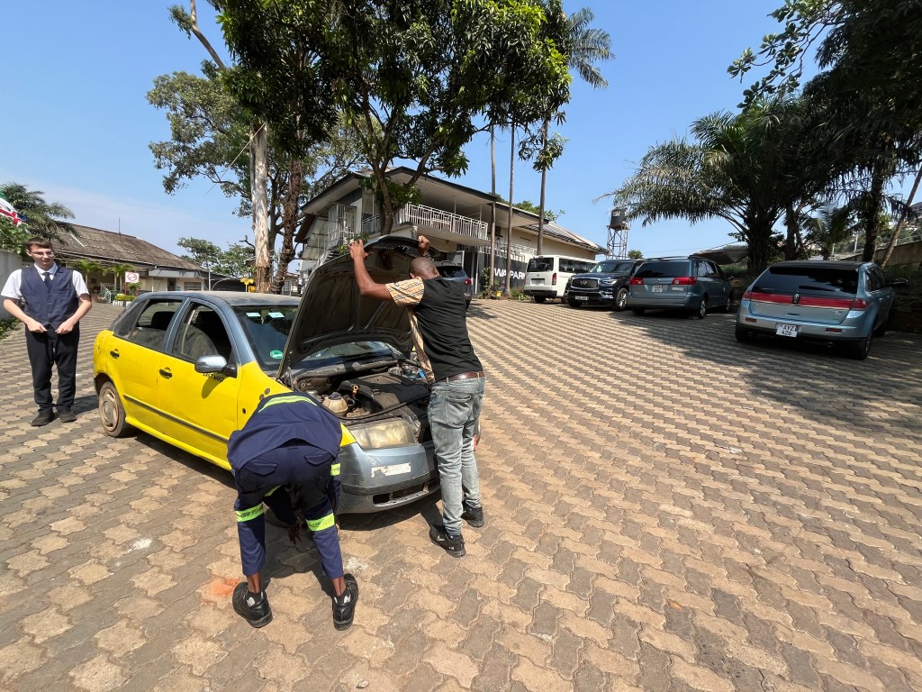 Wie gesagt, es ging etwas bergab. Die Bremsen funktionieren nicht – „er hat zu wenig Sprit“, meinte er, so dass bei Schräglage der Wagen auch nicht anspringt. Wir also rückwärts den Parkplatz einen Hang runter ohne Bremsen. Manpower zum Bremsen war gefragt – Gott sei Dank nur ein kleines Fahrzeug! So stemmten sich drei Leute gegen das Fahrzeug, damit es „langsam“ und kontrolliert den Parkplatz runter und in ebene Position gebracht werden kann. Ralf war einer der drei und kurz vorm Kollabieren, aber dankbar, dass es nur eine kurze Strecke war!