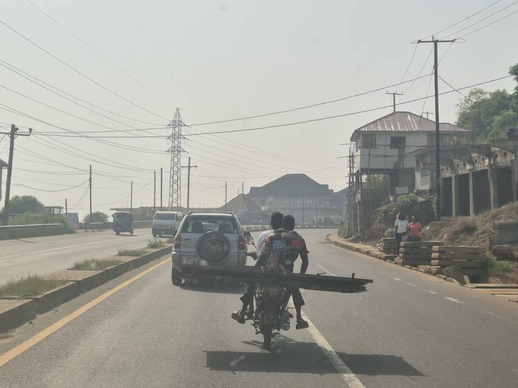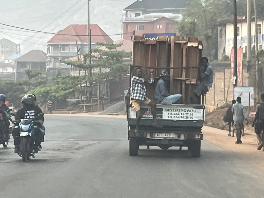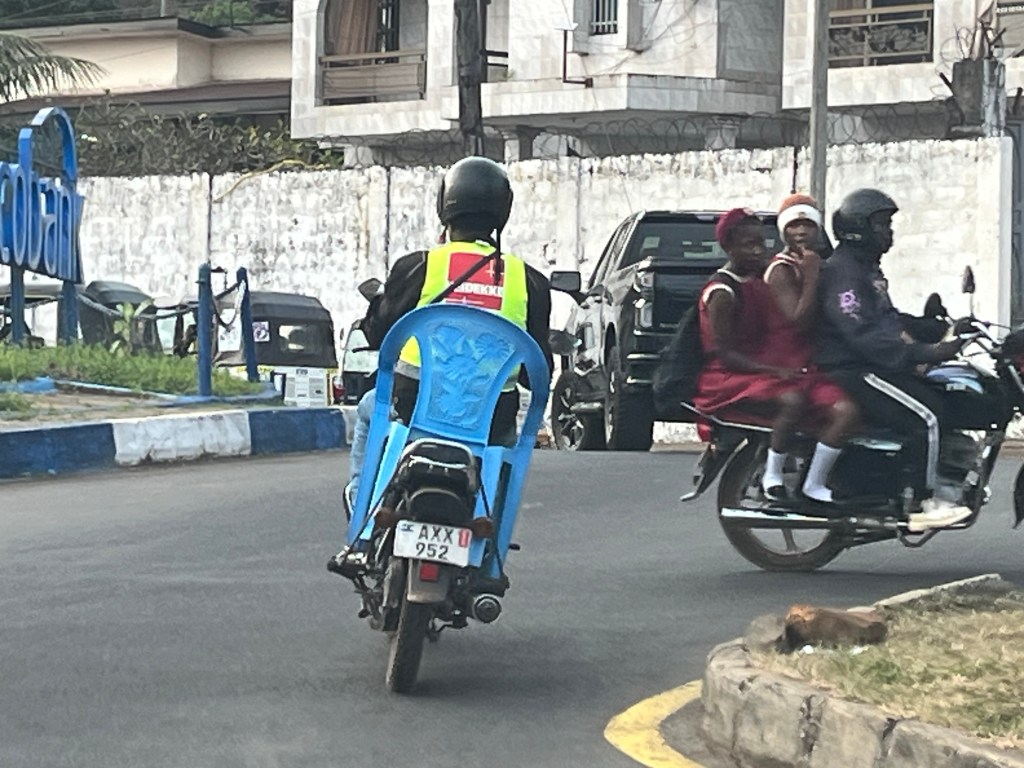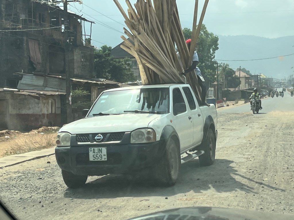 Auch beim Bikefahren gibt es Klassenunterschiede – hier erste Klasse Taxibike!Die Holzstangen sind einfach willkürlich auf der Ladefläche „gestapelt“. Die Ladung ist sogar gesichert – eine Person hält die Ladung umklammert in jeder Hand das Seilende, welches durch die Fahrerkabine gezogen ist. Wer nicht aufpasst, wird mitgenommen, obwohl er gar nicht will ….In Waterloo – rechts und links der Markt wo offen Obst – Gemüse etc. angeboten wird – dazwischen, die Müllhalde.