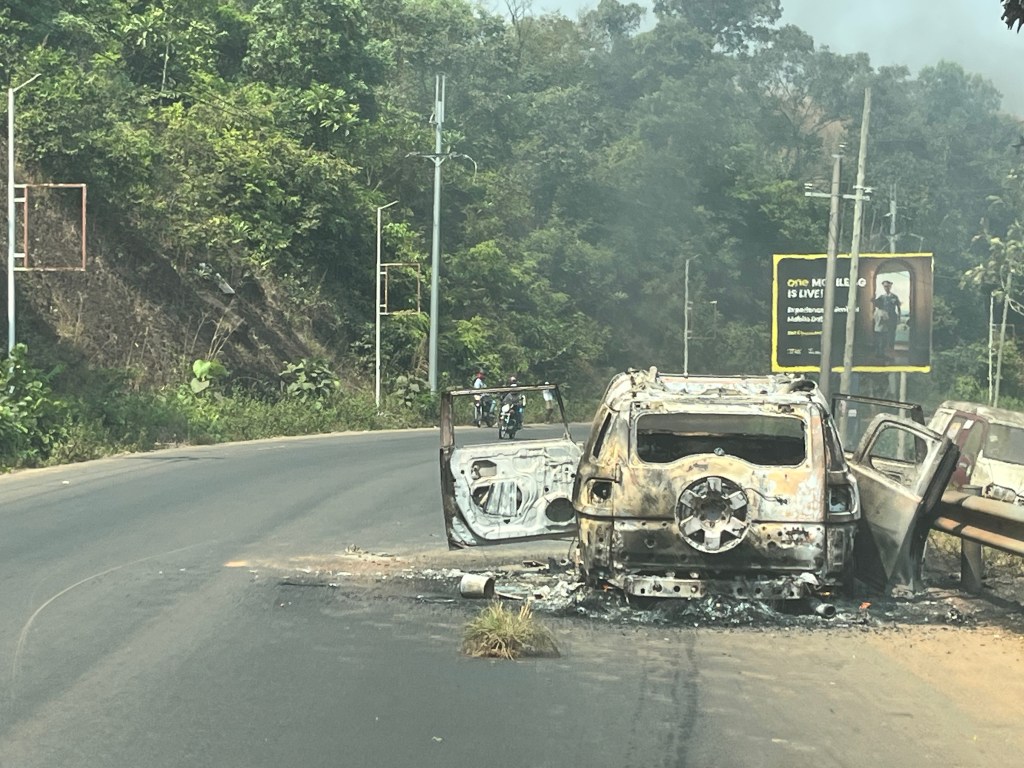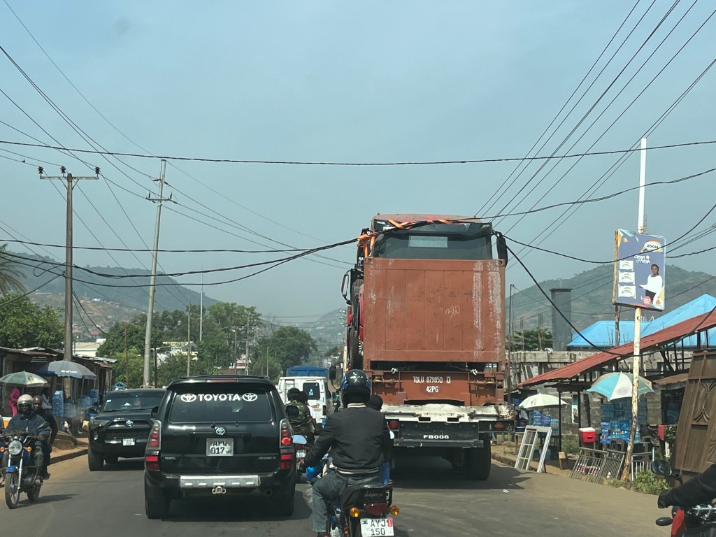 Auch das ist Alltag – ist ja schon im Auto nicht schön – aber habe das mal auf dem Bike die ganze Zeit in Front of you!!Auf dem Schulweg – kurz vor uns hatte dieses Auto Feuer gefangen – es brannte noch leicht, als wir es dann passierten – keiner wurde verletzt.Wer hält wen?Ein Sattelschlepper der einen Truck abschleppte – nur blöd, daß die Stromkabel da im Weg waren.